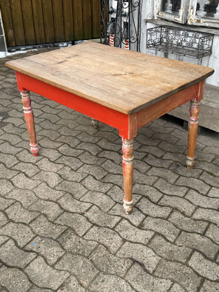 Produktinformationen "Antiker Küchentisch „Werkbank-Rot“ um 1880 – Weichholz mit gedrechselten Beinen"