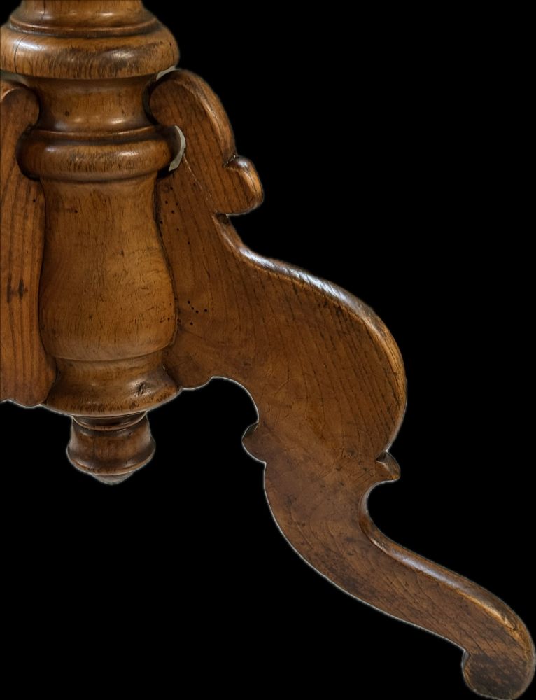 Gefertigt aus Eschenholz besticht er durch seine lebendige Maserung und den warmen Naturton. Die schlanke Tischform ruht auf einer gedrechselten Mittelsäule mit drei elegant geschwungenen Beinen – eine besonders dekorative und zeittypische Konstruktion.