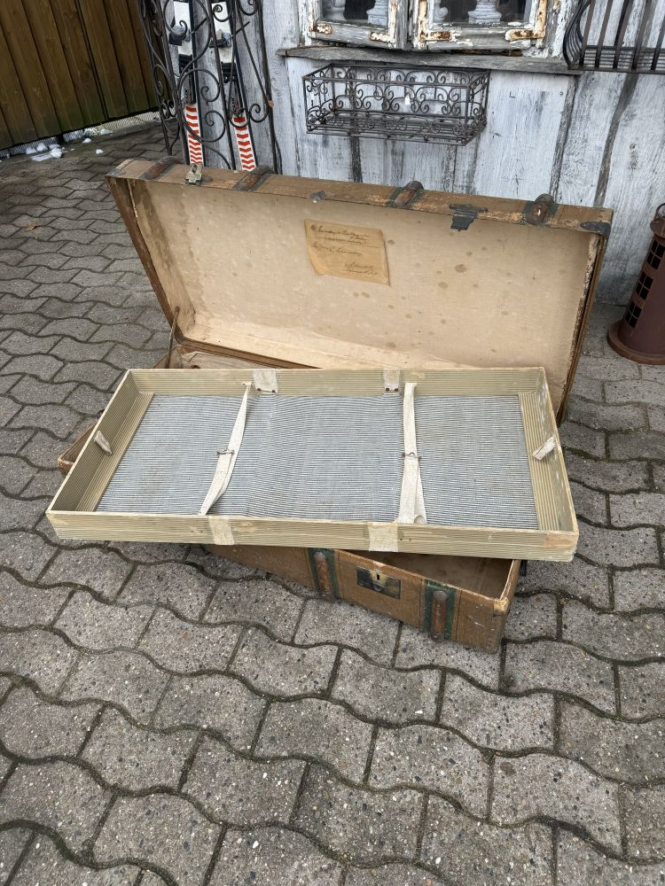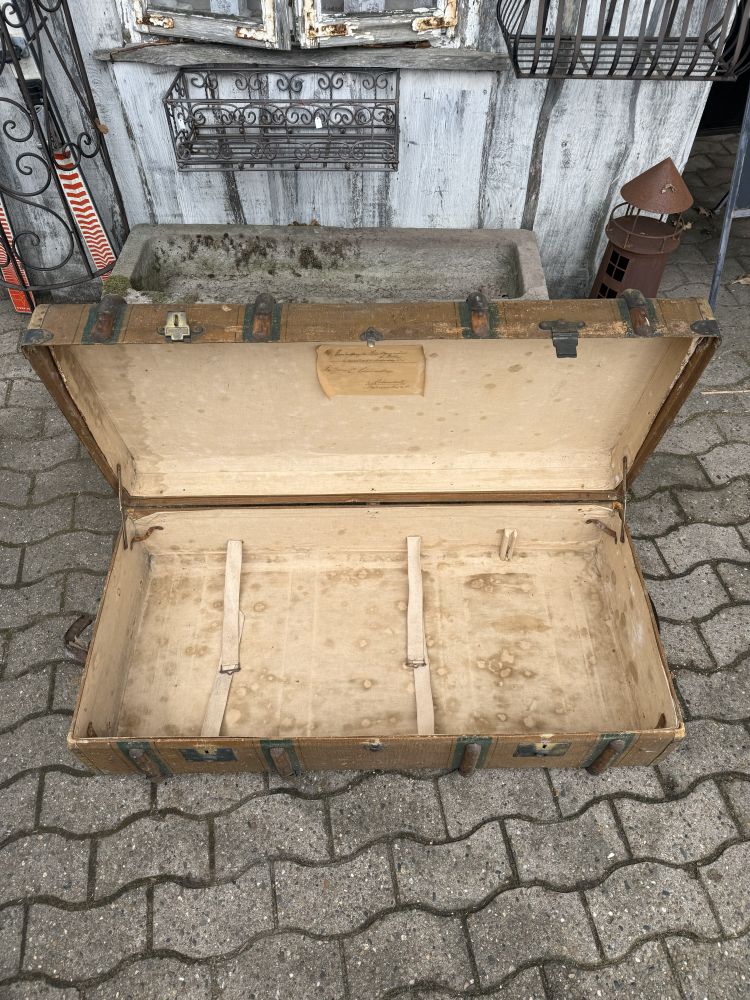 Dieser antike Überseekoffer stammt vermutlich aus der Zeit um 1900 und wurde von der Firma Mädler gefertigt. Der originale Aufdruck „ML“ ist noch sichtbar – ein wunderbares Detail, das den authentischen Charakter unterstreicht.