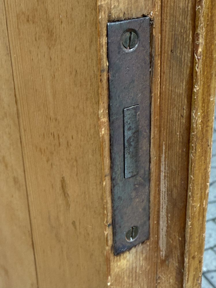 Die Originalbeschläge, Schlösser und der passende Schlüssel sind vollständig erhalten. Die Oberfläche zeigt noch die alte Bierfarbe, die ihm seine unverwechselbare Patina verleiht.