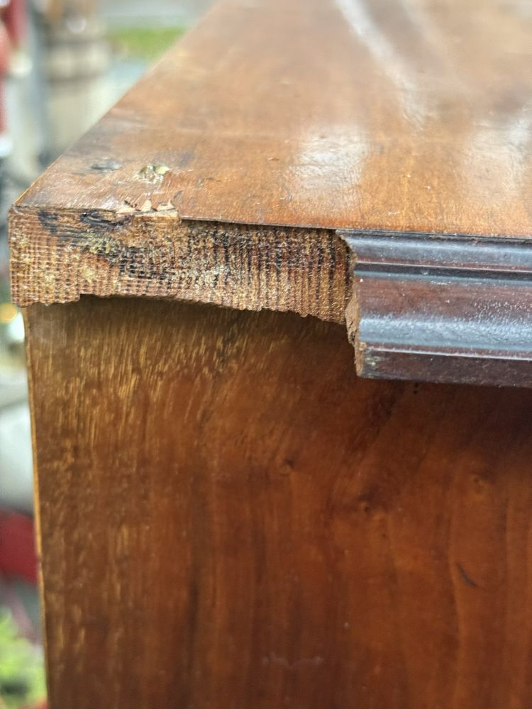 Hinweis: Aufsatz fehlt · kleines Holzstück oben links an der Deckplatte fehlt