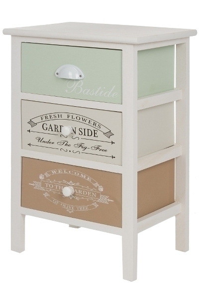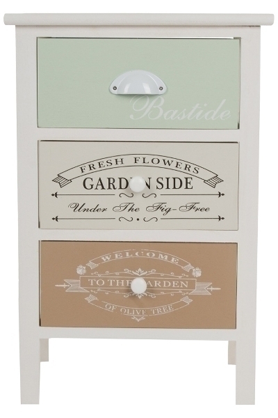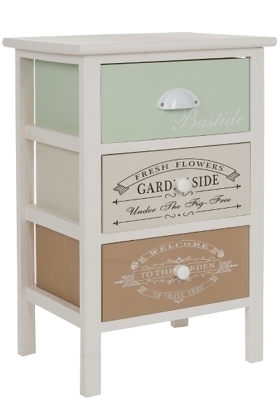 Die Kommode hat drei Schubladen mit Muschelförmigen Griffen oder süßen Holzknöpfen, in denen Sie eine Menge verstauen können.