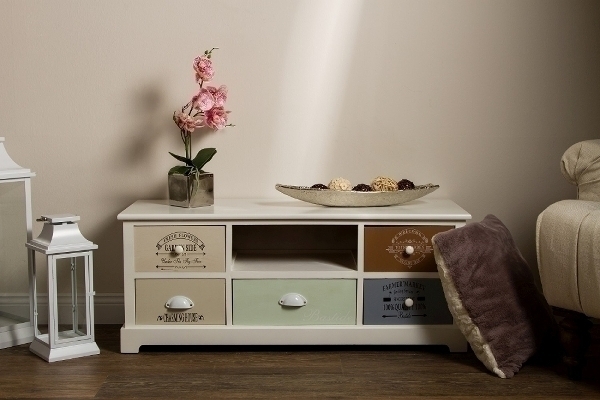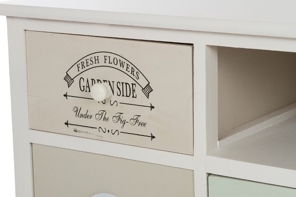 Die unterschiedlichen Aufdrucke auf den Schubladen geben dem Möbelstück eine verspielte Optik.