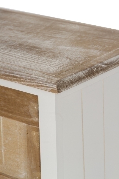 Die Kommode Beatrice besteht aus komplett weiß lackierten Holz mit braunen Elementen, die weiß gewischt sind und sich wunderschön ins Komplettbild einfügen.