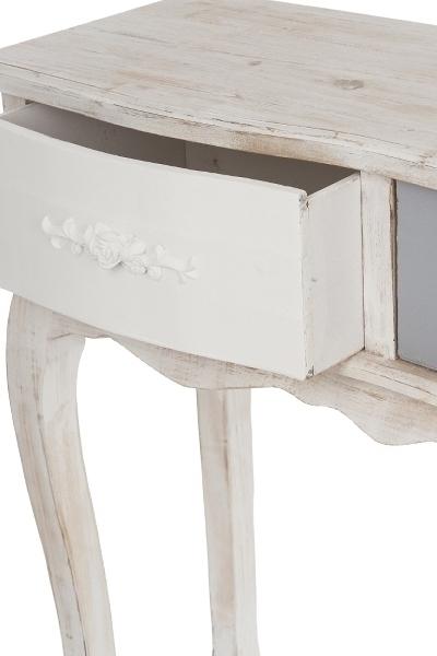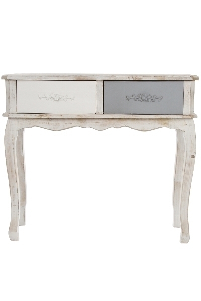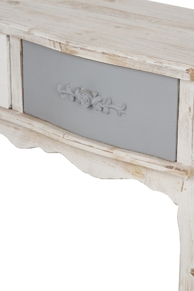 Der Korpus in Antikweiß und die Schubladen in grau und weiß mit modellierten Rosengriffen sorgen dafür, dass diese Konsole ein Highlight in Ihrem Zuhause wird.