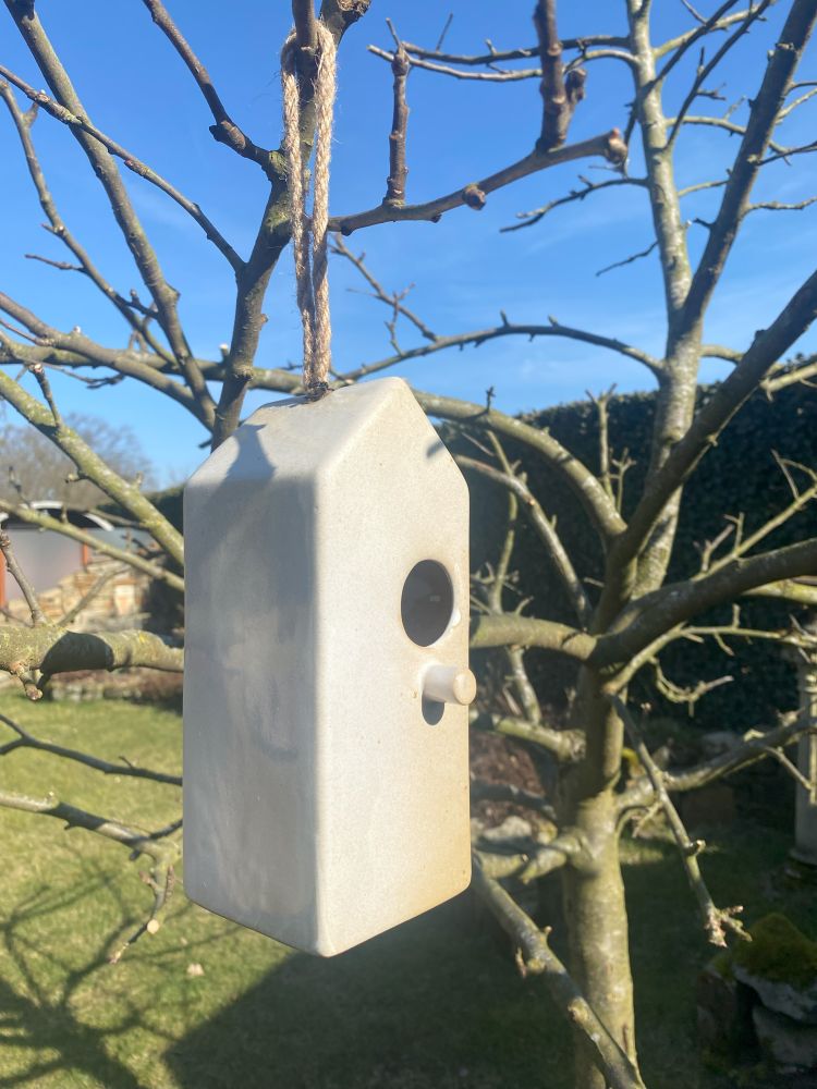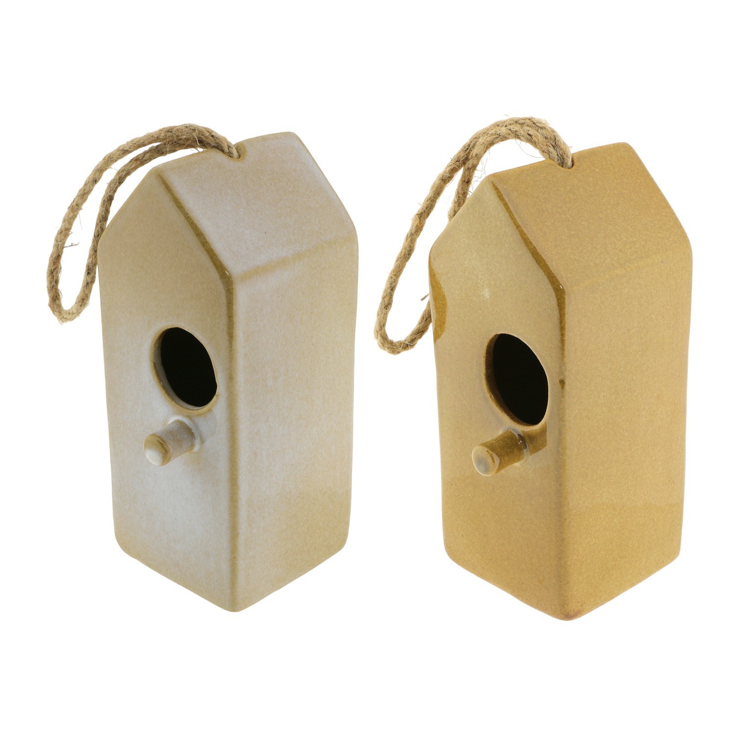 Vogelhäuschen aus Keramik / creme-Natur. An dem von Hand gefertigtem Häuschen befindet sich ein Seil zum bequemen aufhängen des Häuschens. Die Maße sind: 20x8x8cm. ohne Seil! Wir bieten das Vögelhäuschen hier im Shop in 2 Farben an.
