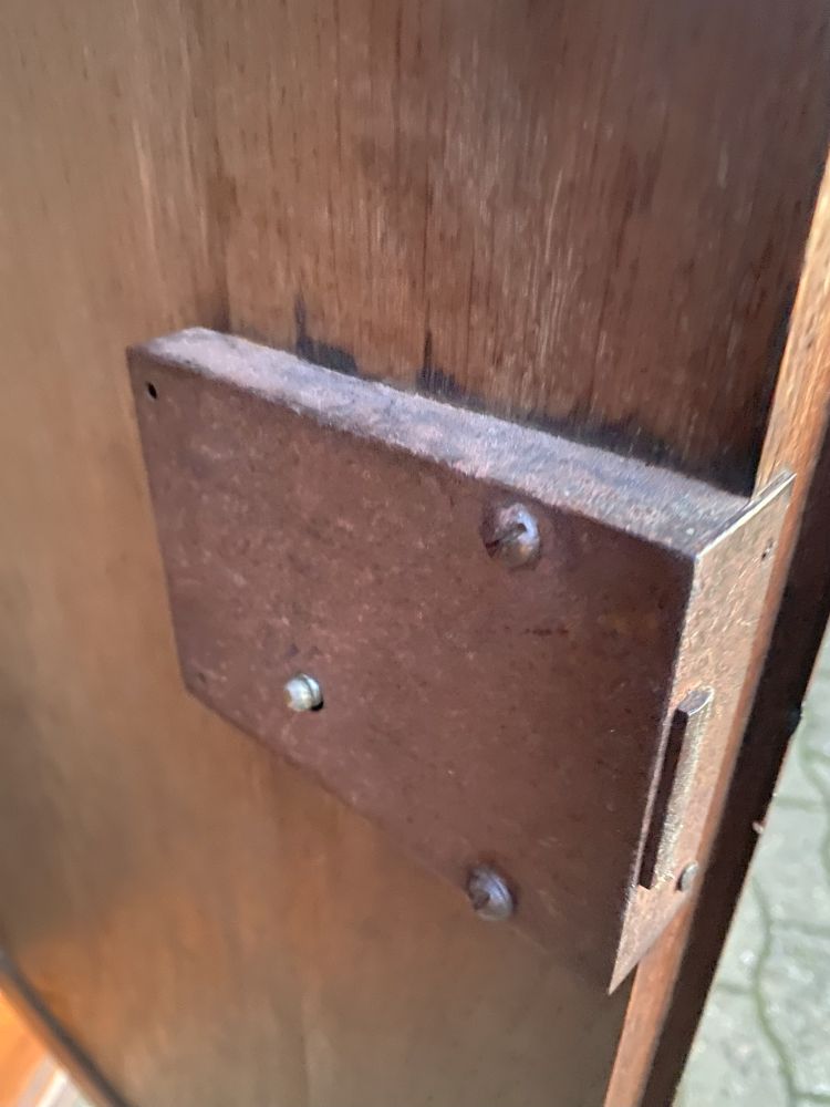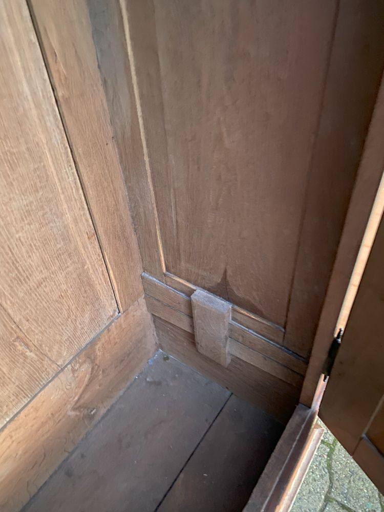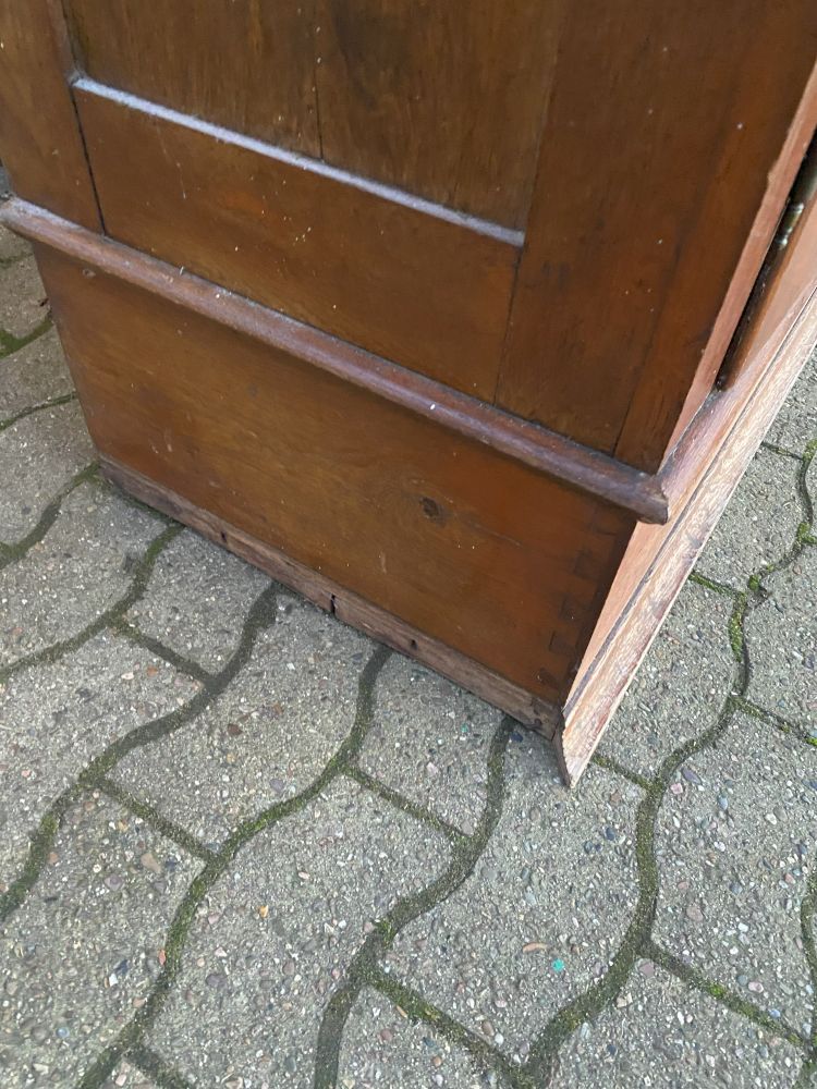 Die Möbelbeine fehlen sowie einige Leisten. Bei der Oberfläche handelt es sich um Schellack. Schloss und Möbelbeschläge stammen aus der Zeit, der Schlüssel scheint ergänzt worden zu sein. Die Türen lassen sich über 90 Grad öffnen Dank außenliegender Türbänder. Der Schrank ist zerlegbar und wir durch 4 Holzkeile zusammen gehalten. Der Auf u. Abbau geht schnell und bequem. Innen befinden sich Garderobenhaken aus Holz die sich schwenken lassen...praktisch.