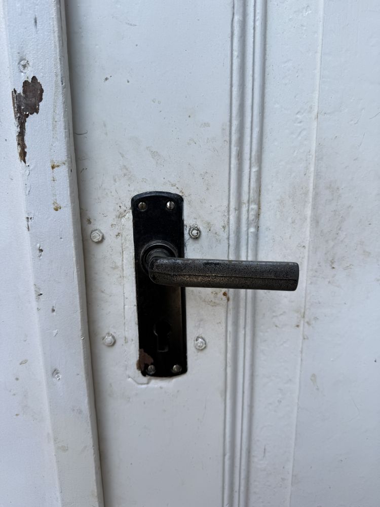 Die Tür ist mit ihrem originalen Kastenschloss und den alten Türbändern komplett erhalten – genau diese Details machen ihren Charakter aus.