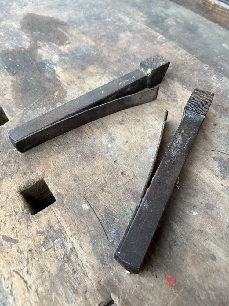Gefertigt aus massivem Buchenholz überzeugt sie durch ihre robuste Bauweise, schwere Substanz und eine Oberfläche, die schöner nicht sein könnte: Kerben, Druckstellen, Farbreste, Gebrauchsspuren – alles Spuren echter Arbeit und Jahrzehnte gelebter Werkstattgeschichte.