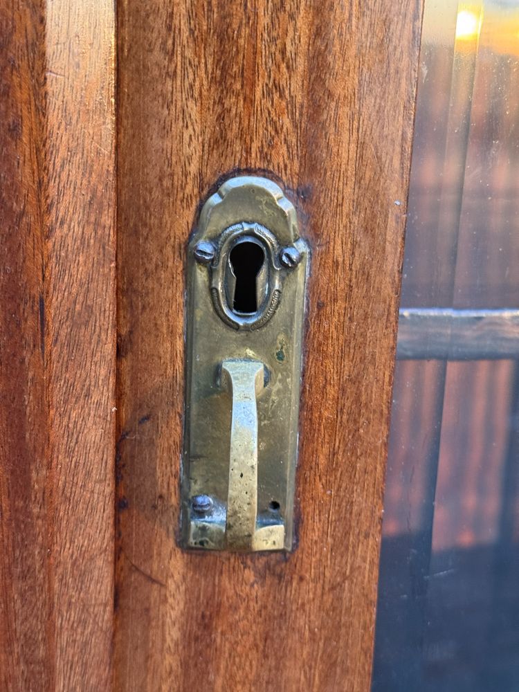 Das originale Möbelschloss mit Schlüssel ist erhalten und funktionstüchtig – ein schönes authentisches Detail dieser Zeit.