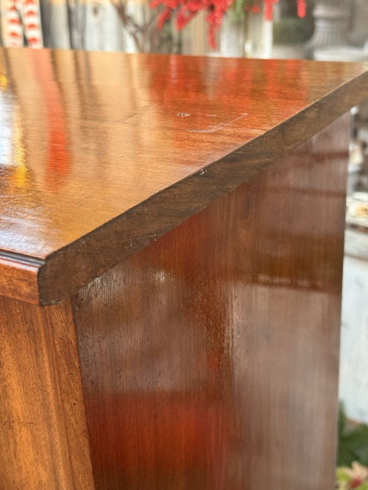 Gefertigt aus Mahagoni, besticht sie durch ihren warmen, tiefen Holzton und die ruhige, hochwertige Ausstrahlung. Die Tür ist mit originalen Glasscheiben im Facettenschliff ausgestattet – ein wunderschönes Detail, das das Licht sanft bricht und dem Möbel seinen besonderen, fast schwebenden Charakter verleiht.