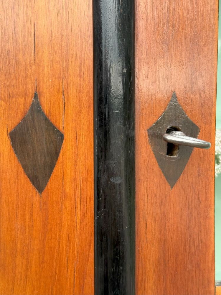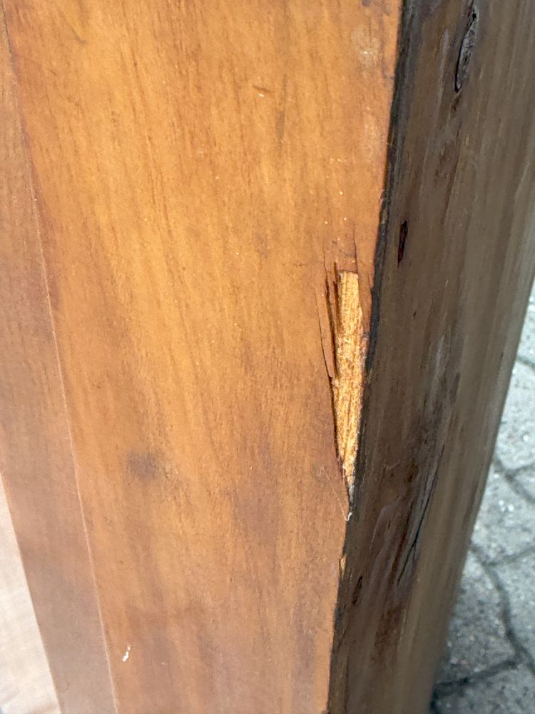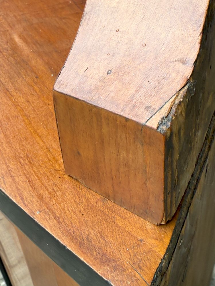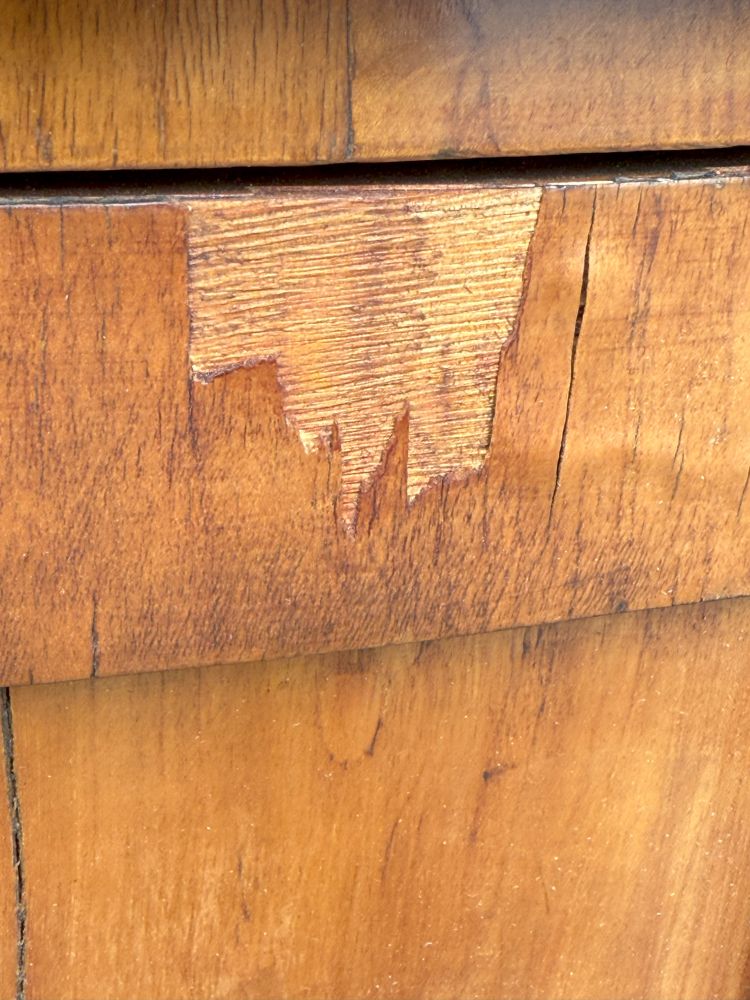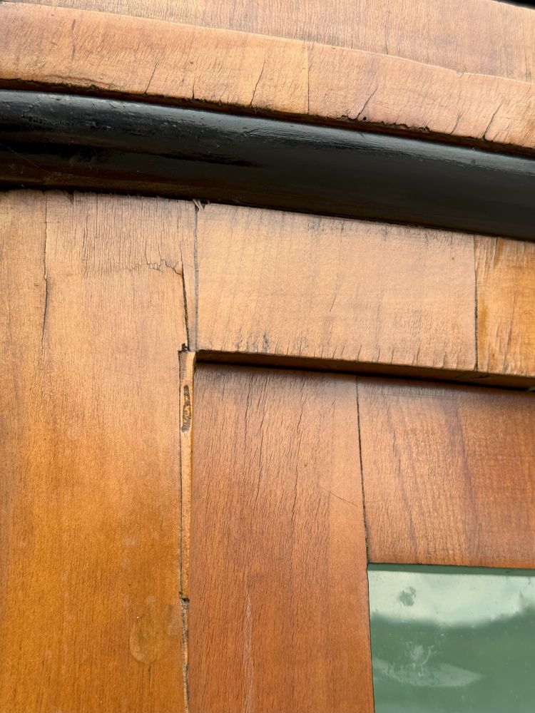 Der Schrank befindet sich in einem unrestaurierten Zustand mit sichtbaren Furnierschäden und altersbedingten Gebrauchsspuren (siehe Fotos). Für Liebhaber originaler Patina oder DIY-Projekte ist er genau das richtige „Projekt“. Alternativ bieten wir Ihnen gern auf Anfrage ein maßgeschneidertes Restaurationsangebot an.Besondere Merkmale: