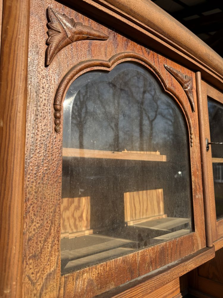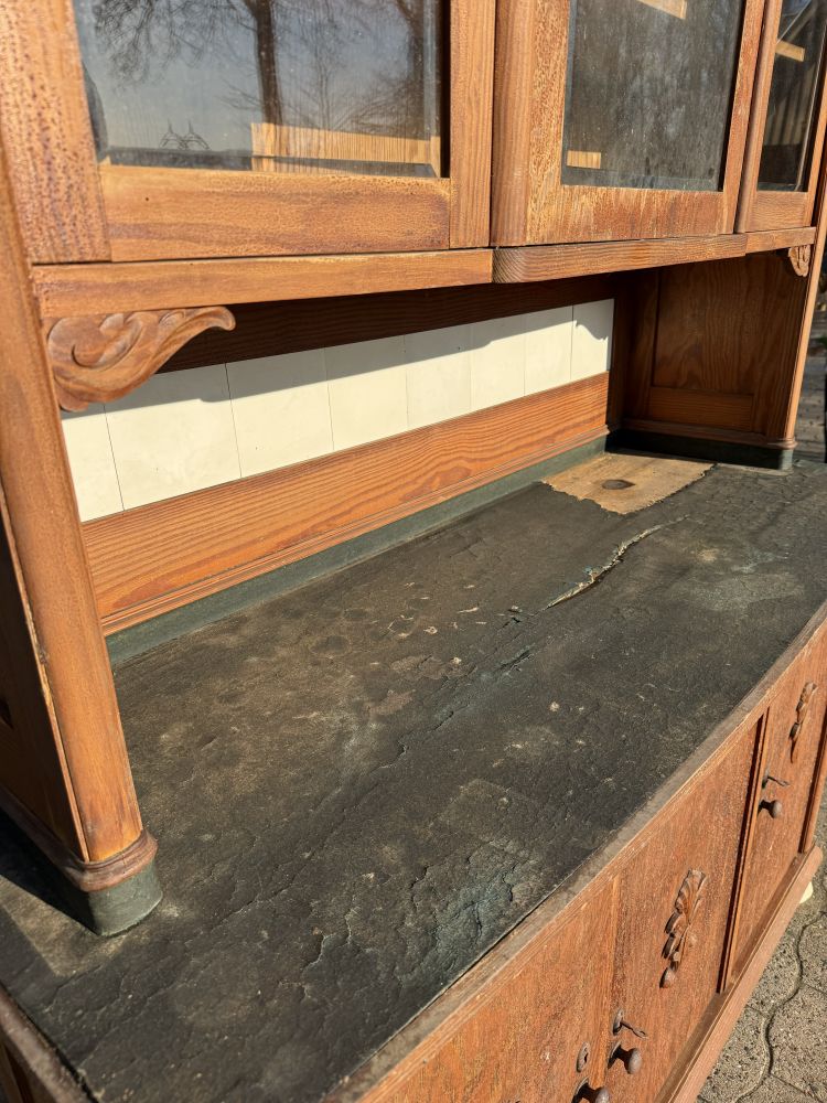 Durch die Zweiteiligkeit lässt sich der Schrank gut transportieren und flexibel aufstellen. Die Kombination aus Stauraum, Arbeitsfläche und Vitrinenaufsatz macht ihn zu einem vielseitigen Möbelstück für Küche, Essbereich oder Laden.
