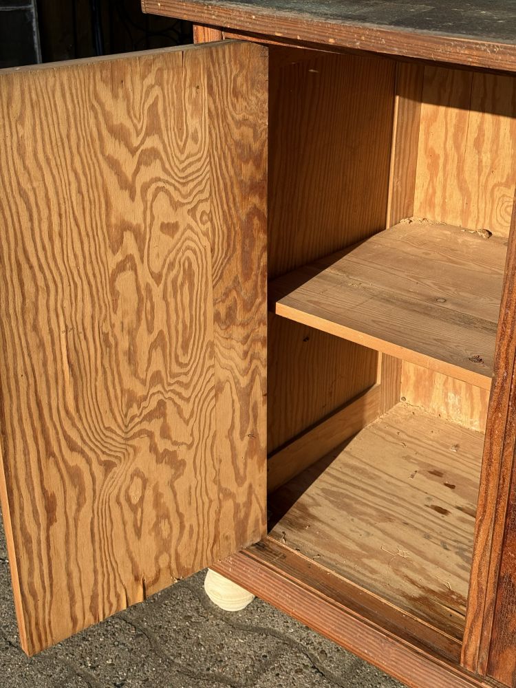 Der Küchenschrank ist unrestauriert und bietet eine perfekte Grundlage für eine individuelle Aufarbeitung.