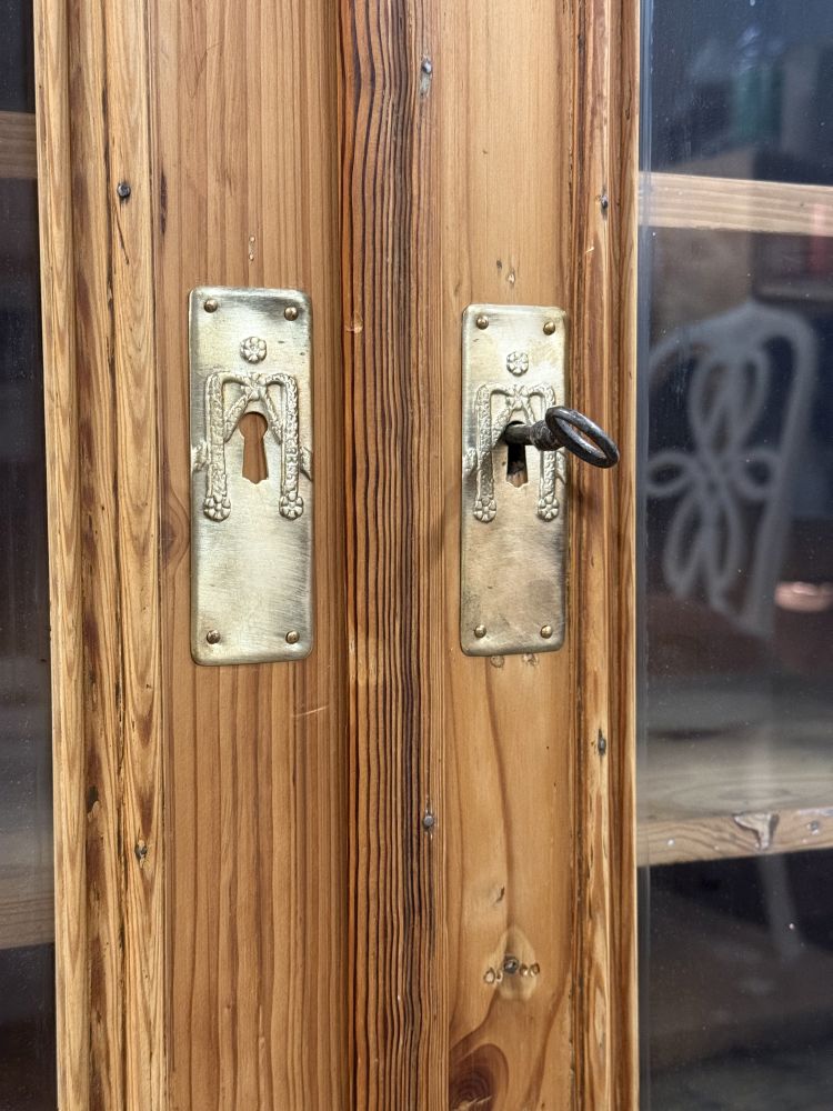 Die originalen Schlösser sind erhalten geblieben. Beschläge und Schlüssel wurden fachgerecht erneuert. Das Glas in den oberen Türen stammt ebenfalls aus der Zeit und unterstreicht den historischen Charakter des Schranks.