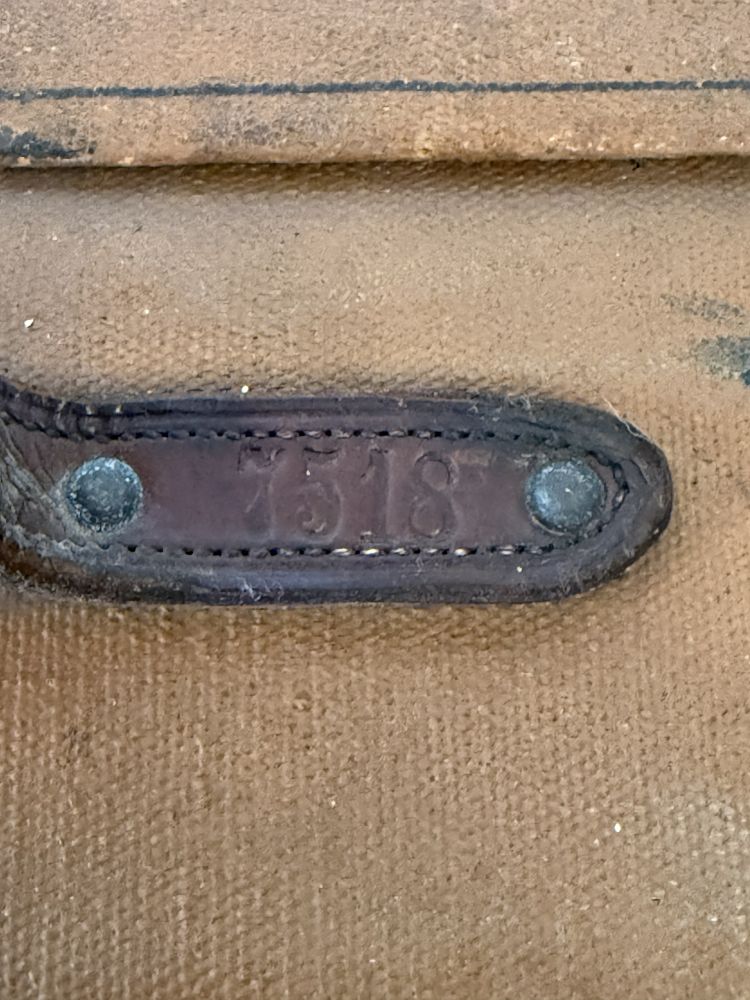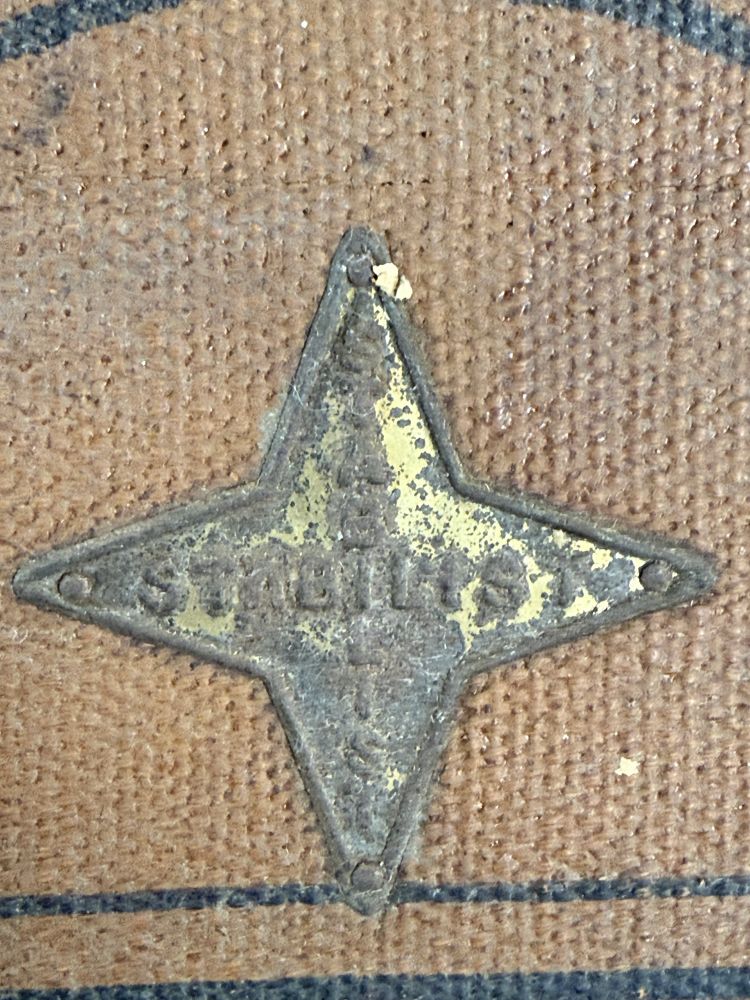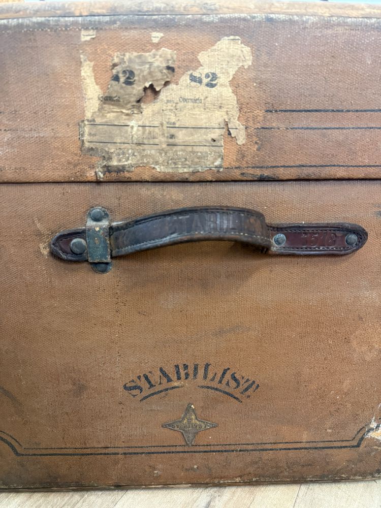 Der Koffer befindet sich im unrestaurierten Originalzustand. Die Oberfläche zeigt altersbedingte Gebrauchsspuren, Patina, Abnutzungen und Spuren vergangener Reisen – genau diese Merkmale machen seinen besonderen Charme aus. Alte Beschläge, Ledergriffe und originale Details sind erhalten geblieben.