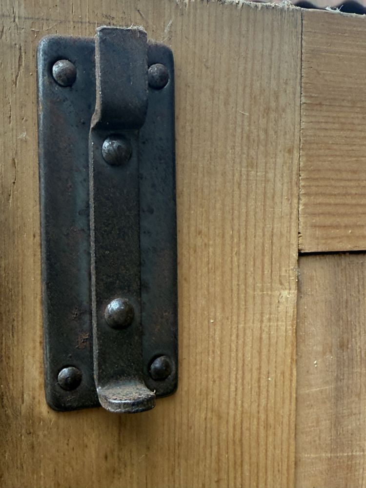 Die Originalbeschläge, Schlösser und der passende Schlüssel sind vollständig erhalten. Die Oberfläche zeigt noch die alte Bierfarbe, die ihm seine unverwechselbare Patina verleiht.
