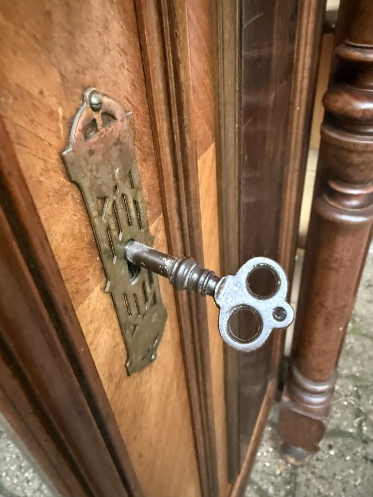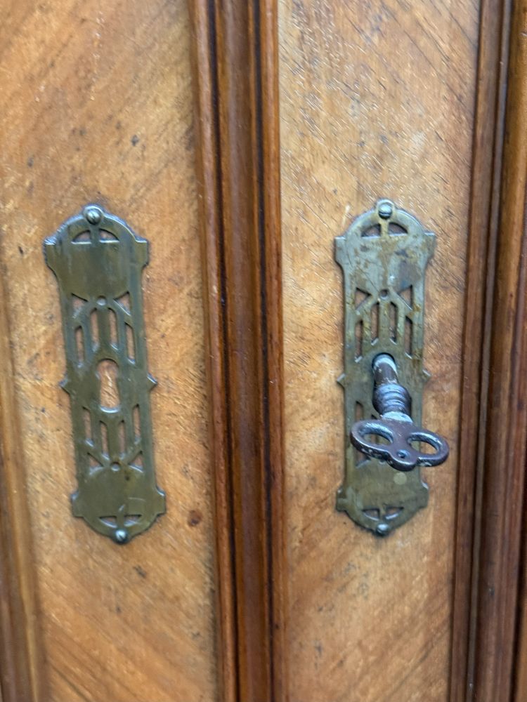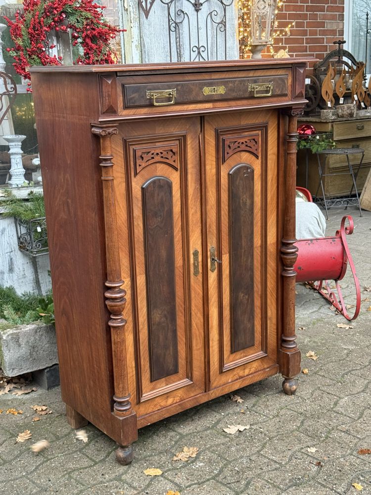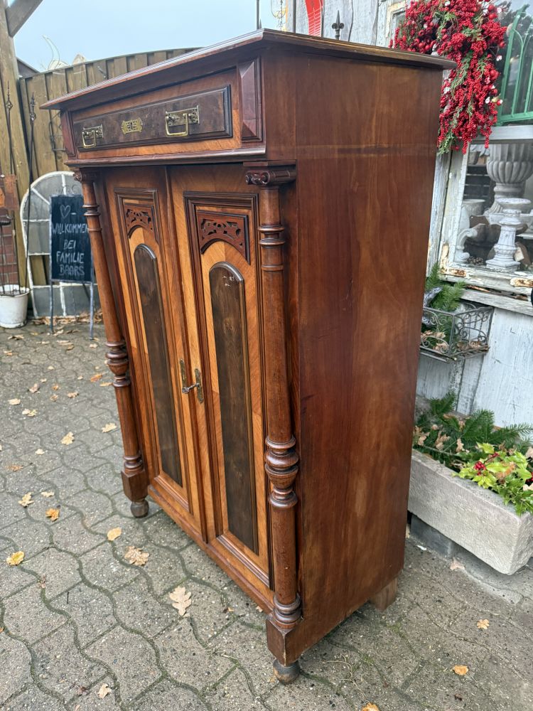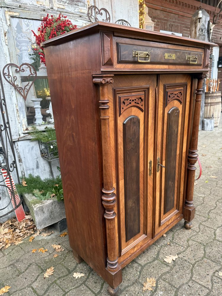 Gefertigt aus Nussbaum und Nussbaumfurnier, wird der Korpus seitlich von klassischen Säulen gerahmt – ein typisches Gestaltungselement der Gründerzeit. Die schmale, hohe Form macht das Möbel besonders vielseitig und perfekt für kleinere Räume, Flure oder gemütliche Wohnbereiche.