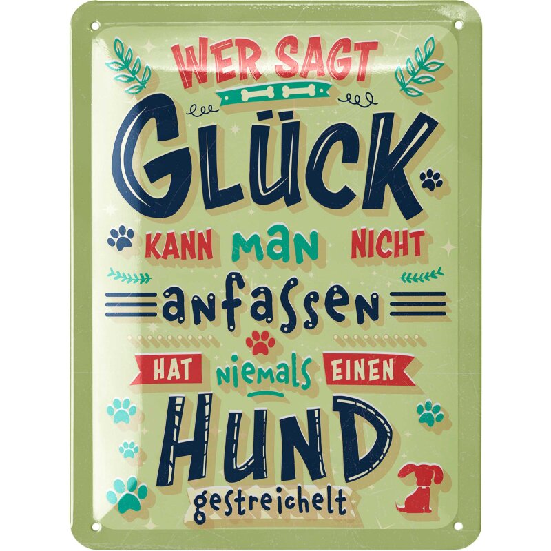 Blechschild „Hundeglück“ – Wer sagt Glück kann man nicht anfassen – Vintage Metallschild grün 15 x 20 cm