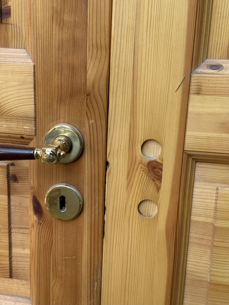 Die Tür stammt aus einer neueren handwerklichen Fertigung (ca. 20–25 Jahre alt) und befindet sich in einem guten gebrauchten Zustand.