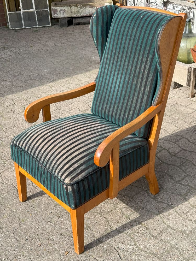 Eleganter Ohrensessel im Biedermeier-Stil (zweite Zeit), gefertigt aus stabilem Eschenholz. Der Sessel wurde vor rund 30 Jahren bereits restauriert und neu bezogen. Die Polsterung ist noch intakt, der Stoff sollte jedoch erneuert werden.