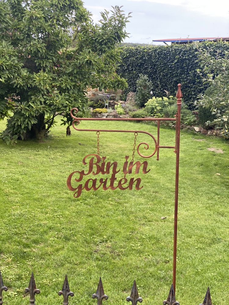 schöner großer Gartenstecker "BIN IM GARTEN". Der Gartenstecker hat eine Rostoberfläche. Der Schildausleger ist verziert gearbeitet. Unter befinden sich 2 Erdspieße für einen sicheren Halt. Kleines Extra: selbst an den Erdspießen befindet sich eine Verzierung. Der Schriftzug ist mit Ketten aus Eisen am Stecker befestigt.