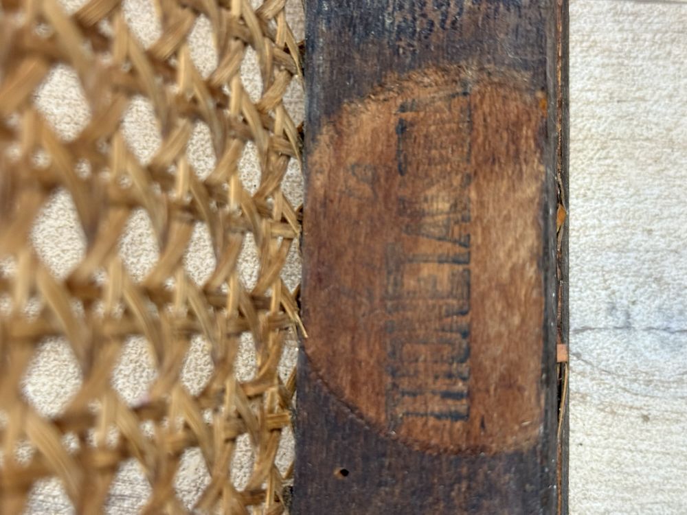 Die runde Sitzfläche sowie die geschwungene Rückenlehne sind mit originalem Wiener Geflecht bespannt – das Geflecht ist vollständig intakt und in sehr gutem Zustand.