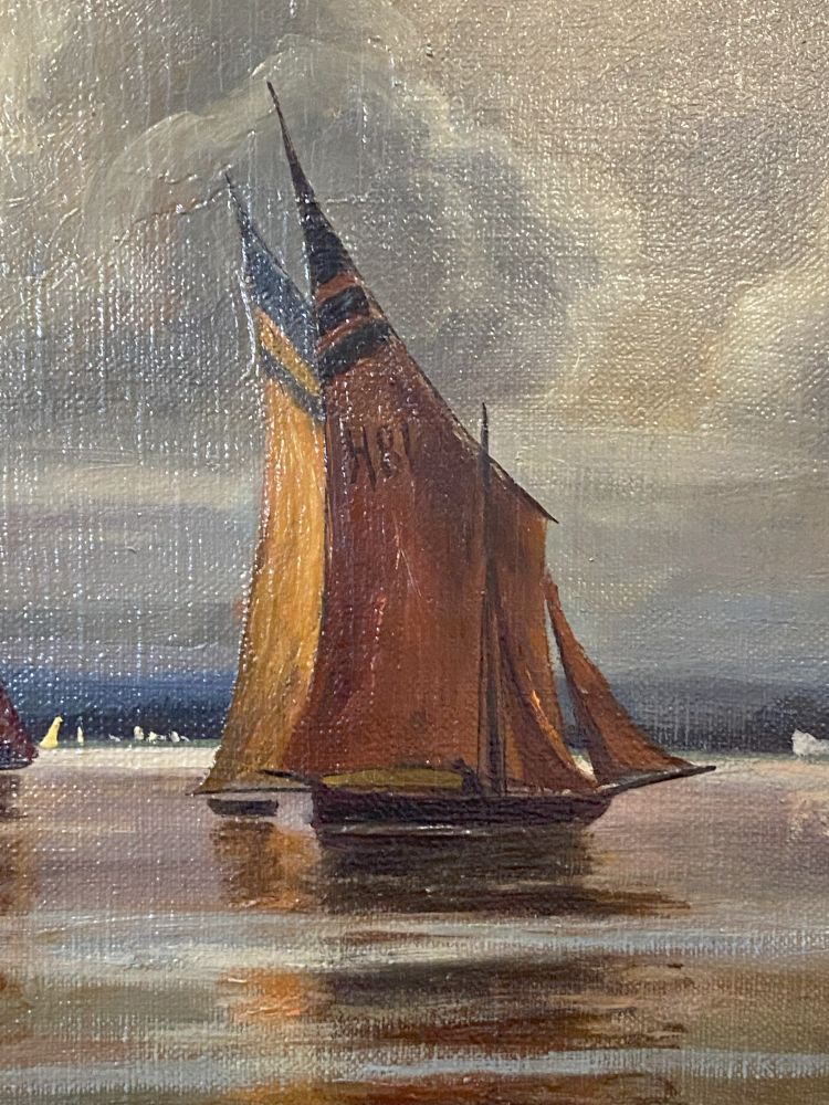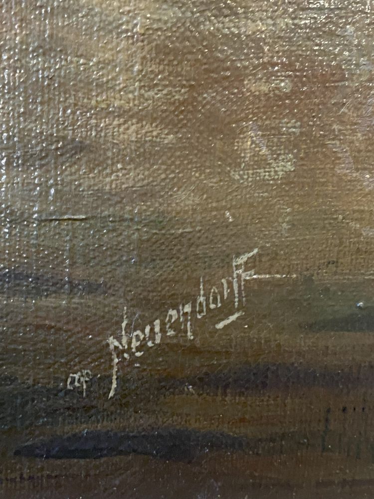 Abendstimmung am Wasser! Angler im Boot / Öl auf Leinwand. Mit Rahmen 100 x 78 cm / ohne Rahmen 63 x 87 cm. Das Gemälde wurde unten rechts mit Neuendorf signiert. Uns ist über den Maler nichts bekannt.