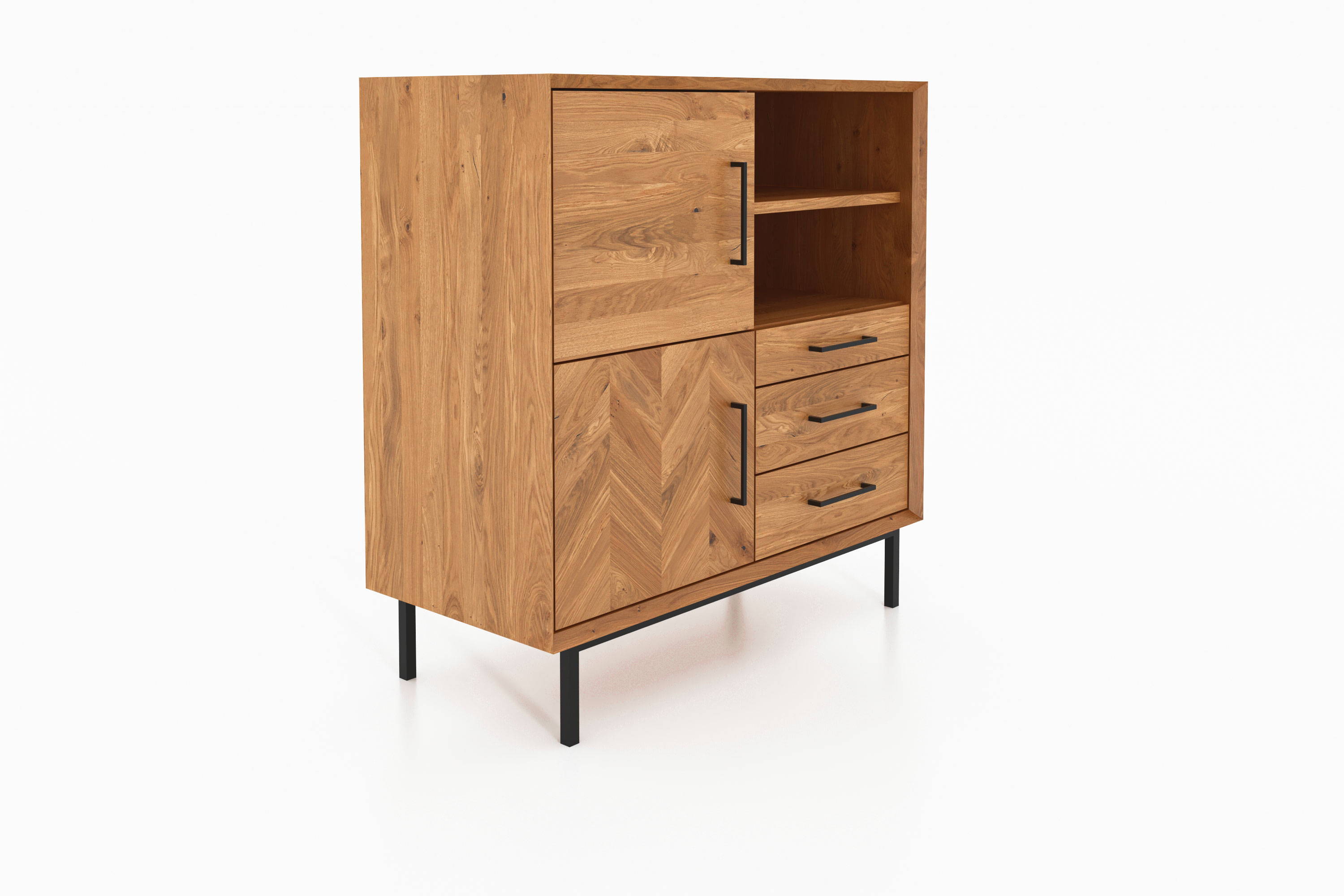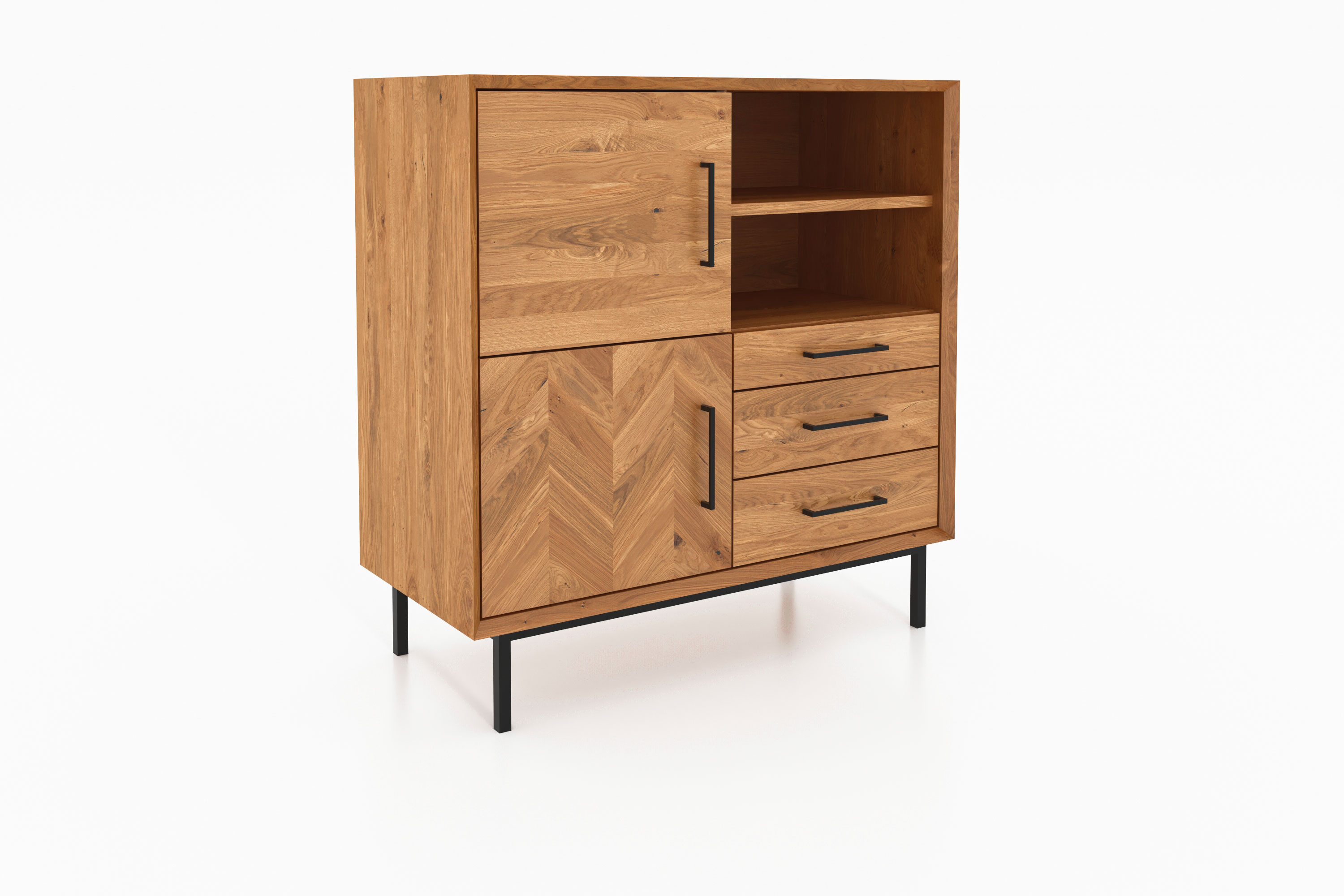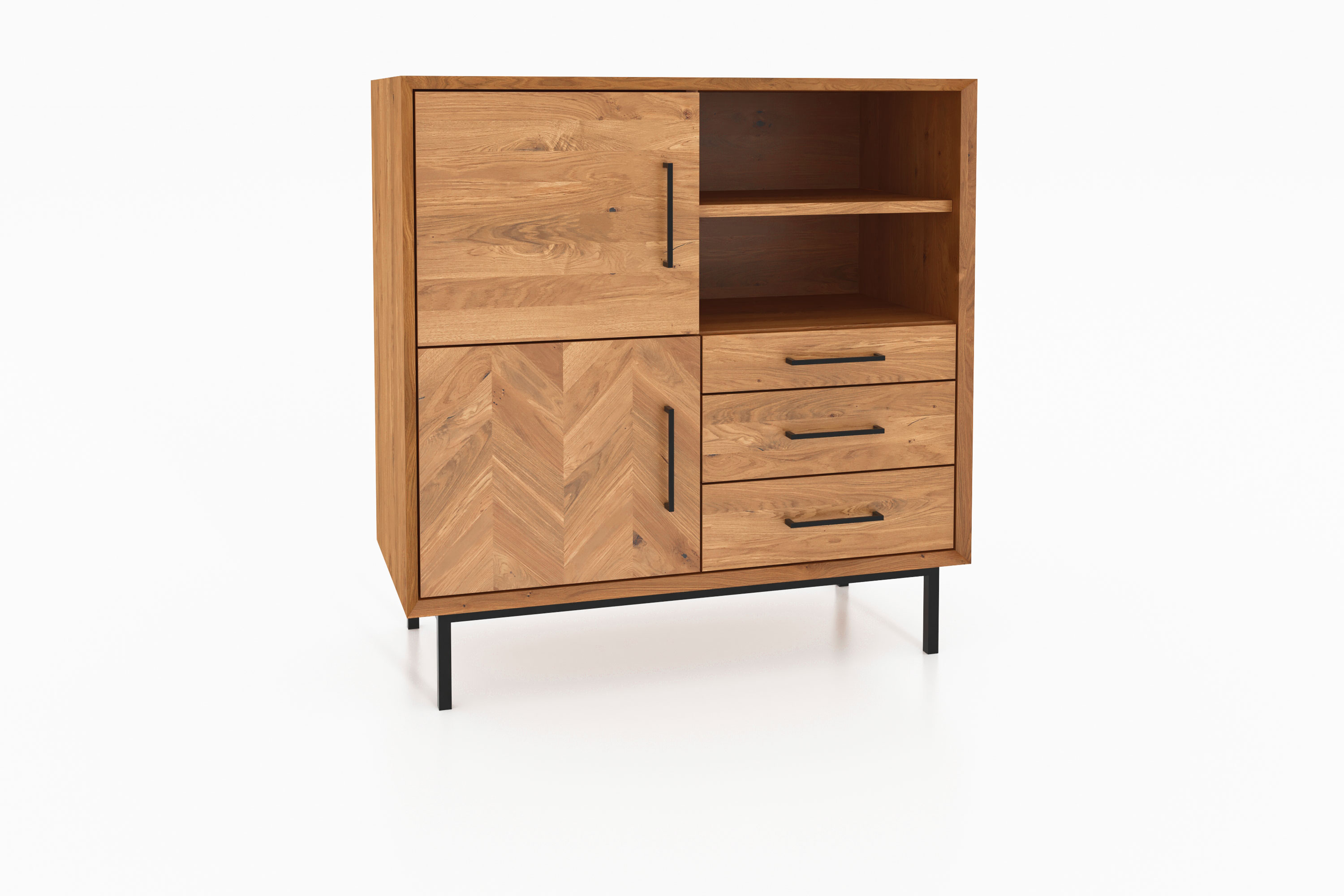 Highbord - Kommode 2 Türen & 3 Schubladen & Freifach / Abies 2744. Die Möbelserie Abies verkörpert ein wenig den schlichten Look der 60er Jahre. VINTAGELOOK mit Handwerkskunst neu in Szene gesetzt! Diese Kommoden haben eine schöne Höhe von 95cm, etwas höher als herkömmliche Kommoden aber nicht so hoch wie ein Halbschrank. Durch diese Zwischengröße passen "SIE" in viele Wohnbereiche, ob im modernem Loft oder im Einfamilienhaus immer ein absoluter EYECATCHER! In dieser Modellserie finden Sie 4 verschiedene Ausführungen mit den Grundmaßen; B- 97 cm x T- 45 cm x H- 95 cm. Schöne Propositionen mit wechseln Fronten. An 3 Highbords dieser Serie finden Sie das "Fischgrätenmuster" in den Türen wieder.
