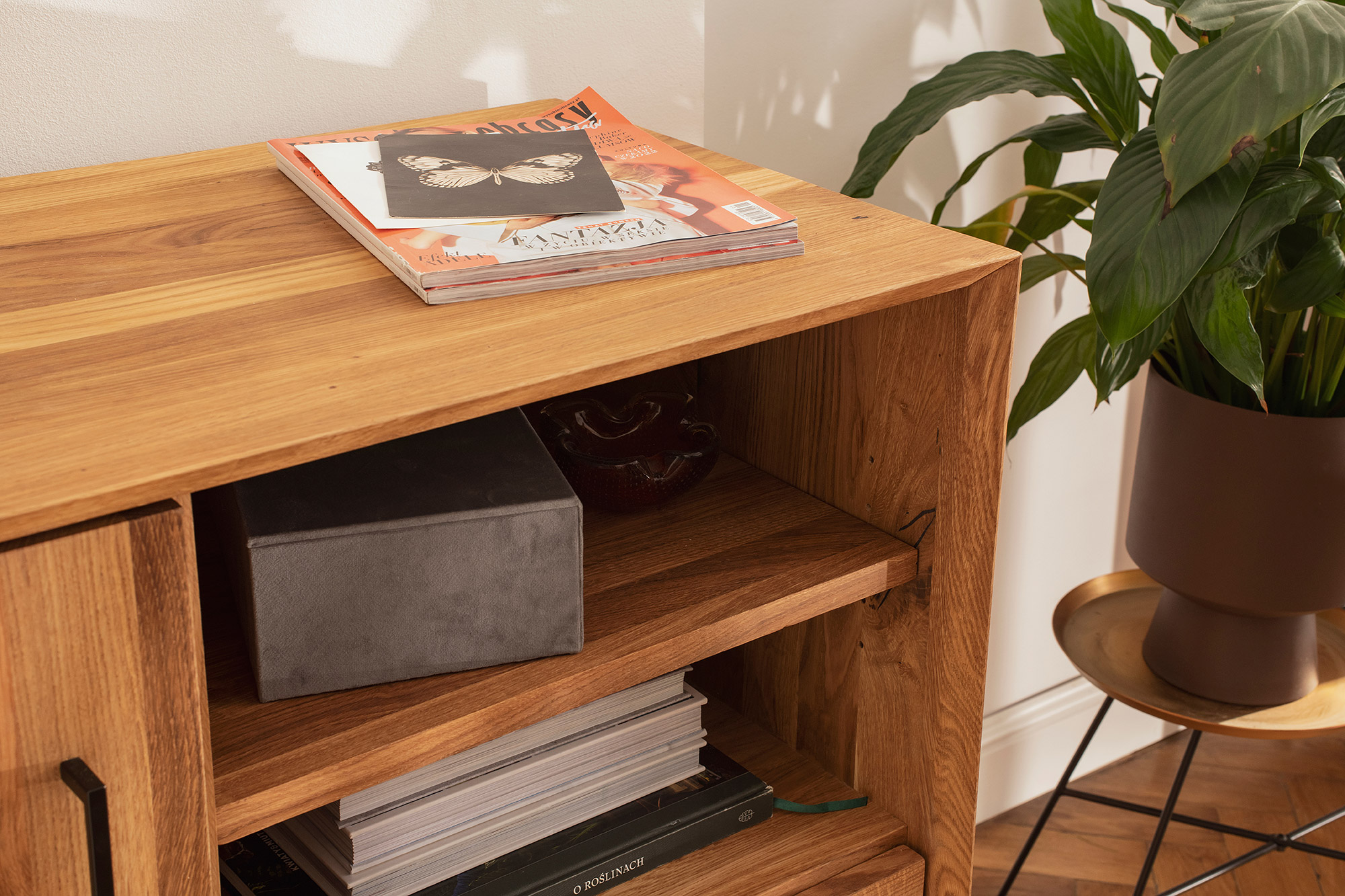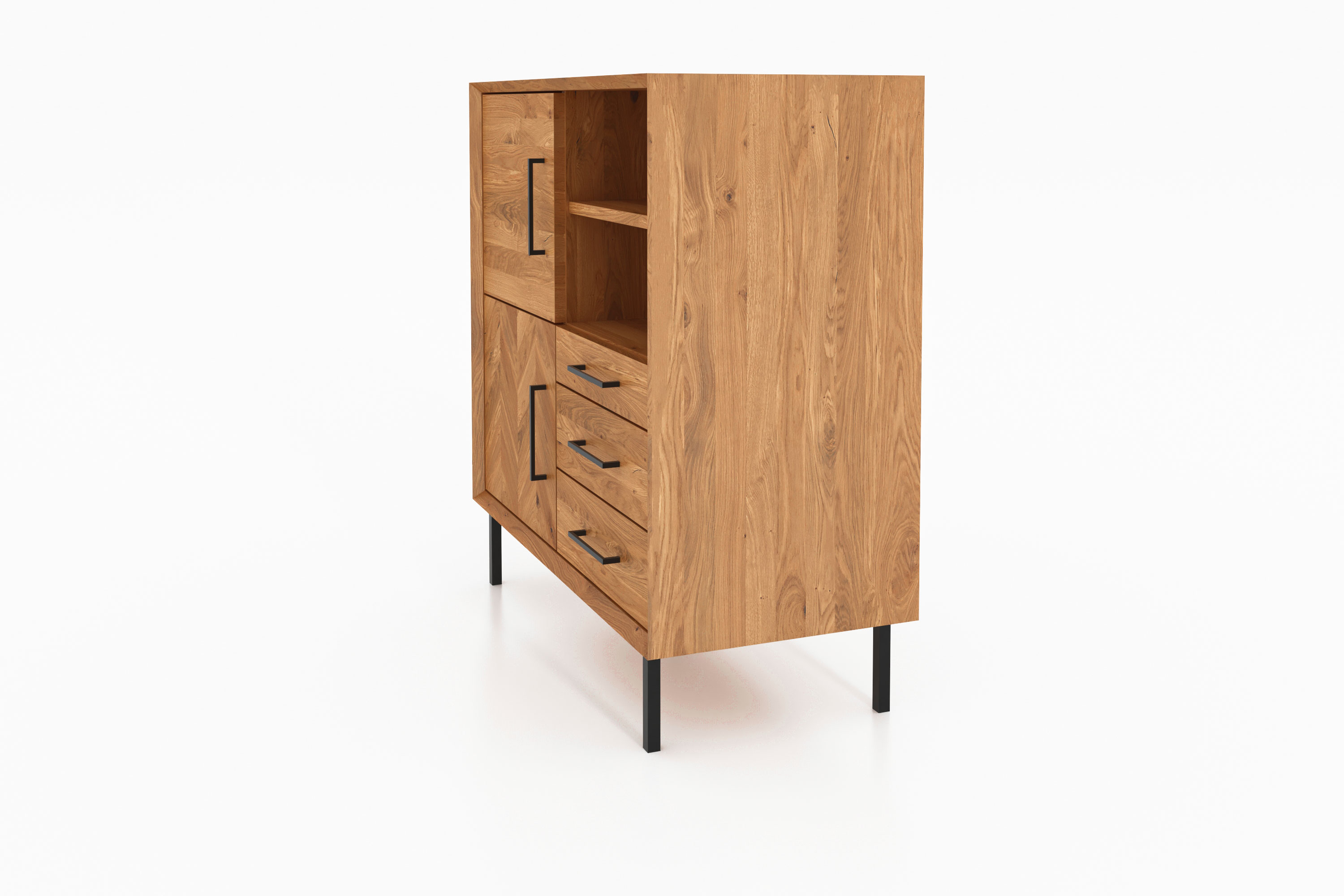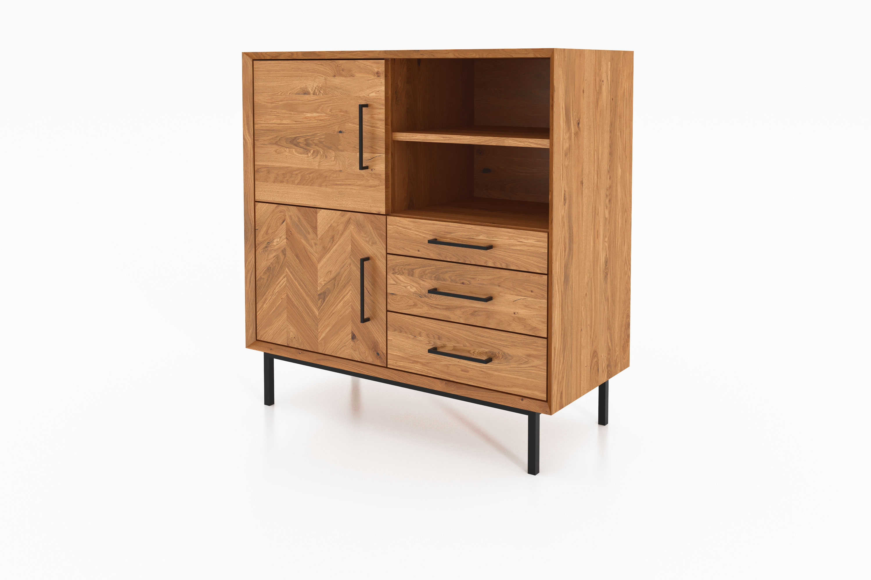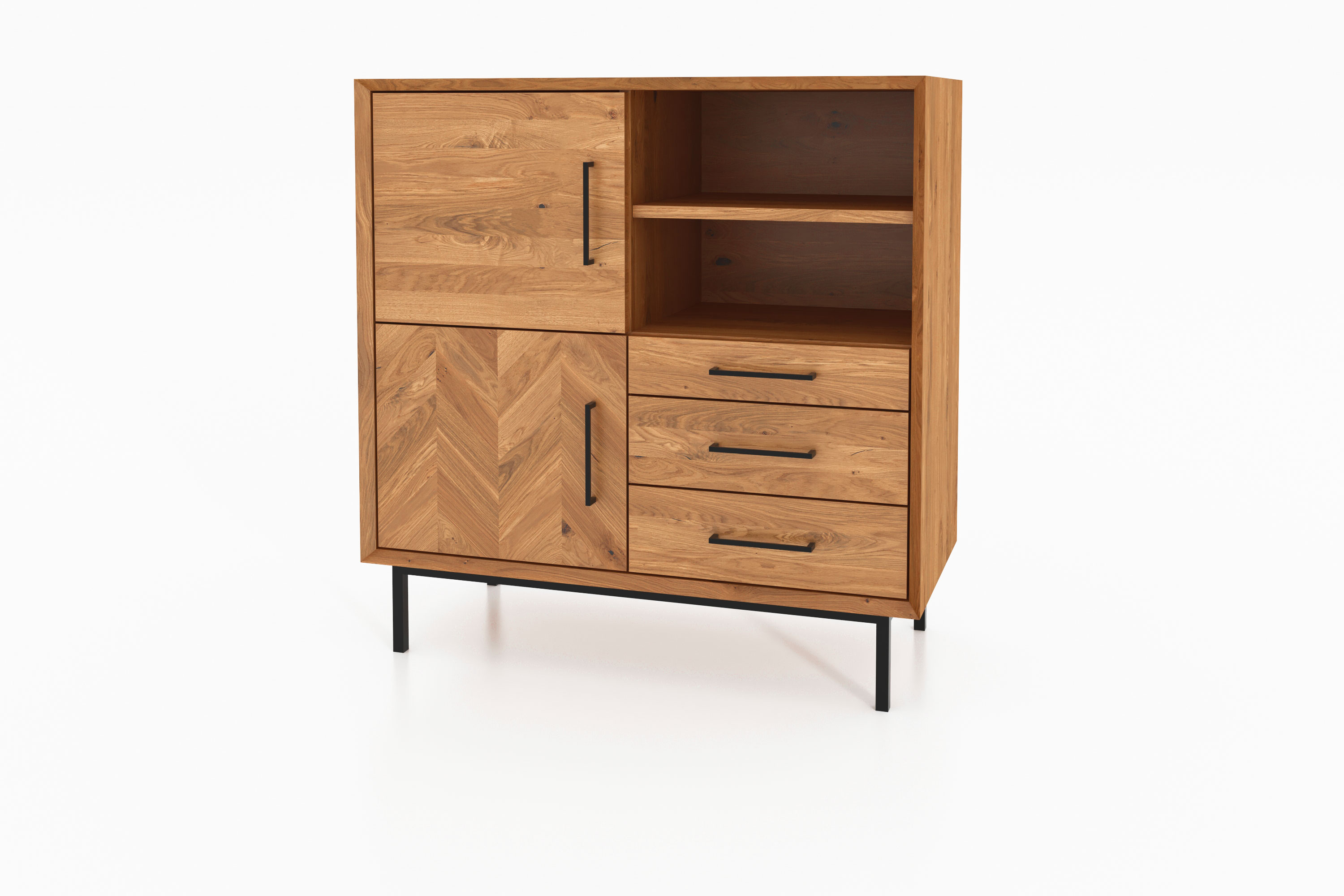 Highbord - Kommode 2 Türen & 3 Schubladen & Freifach / Abies 2744. Die Möbelserie Abies verkörpert ein wenig den schlichten Look der 60er Jahre. VINTAGELOOK mit Handwerkskunst neu in Szene gesetzt! Diese Kommoden haben eine schöne Höhe von 95cm, etwas höher als herkömmliche Kommoden aber nicht so hoch wie ein Halbschrank. Durch diese Zwischengröße passen "SIE" in viele Wohnbereiche, ob im modernem Loft oder im Einfamilienhaus immer ein absoluter EYECATCHER! In dieser Modellserie finden Sie 4 verschiedene Ausführungen mit den Grundmaßen; B- 97 cm x T- 45 cm x H- 95 cm. Schöne Propositionen mit wechseln Fronten. An 3 Highbords dieser Serie finden Sie das "Fischgrätenmuster" in den Türen wieder.