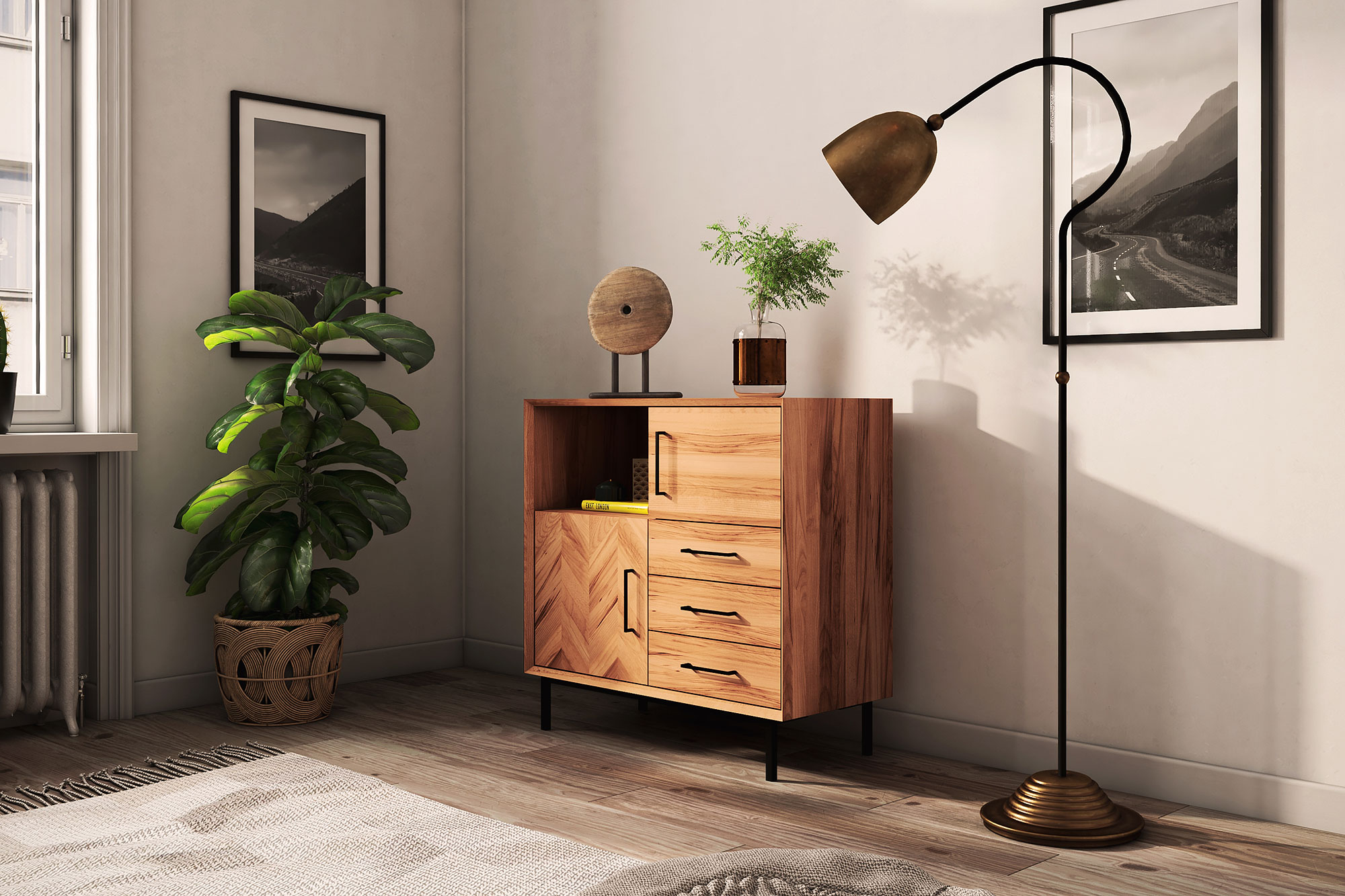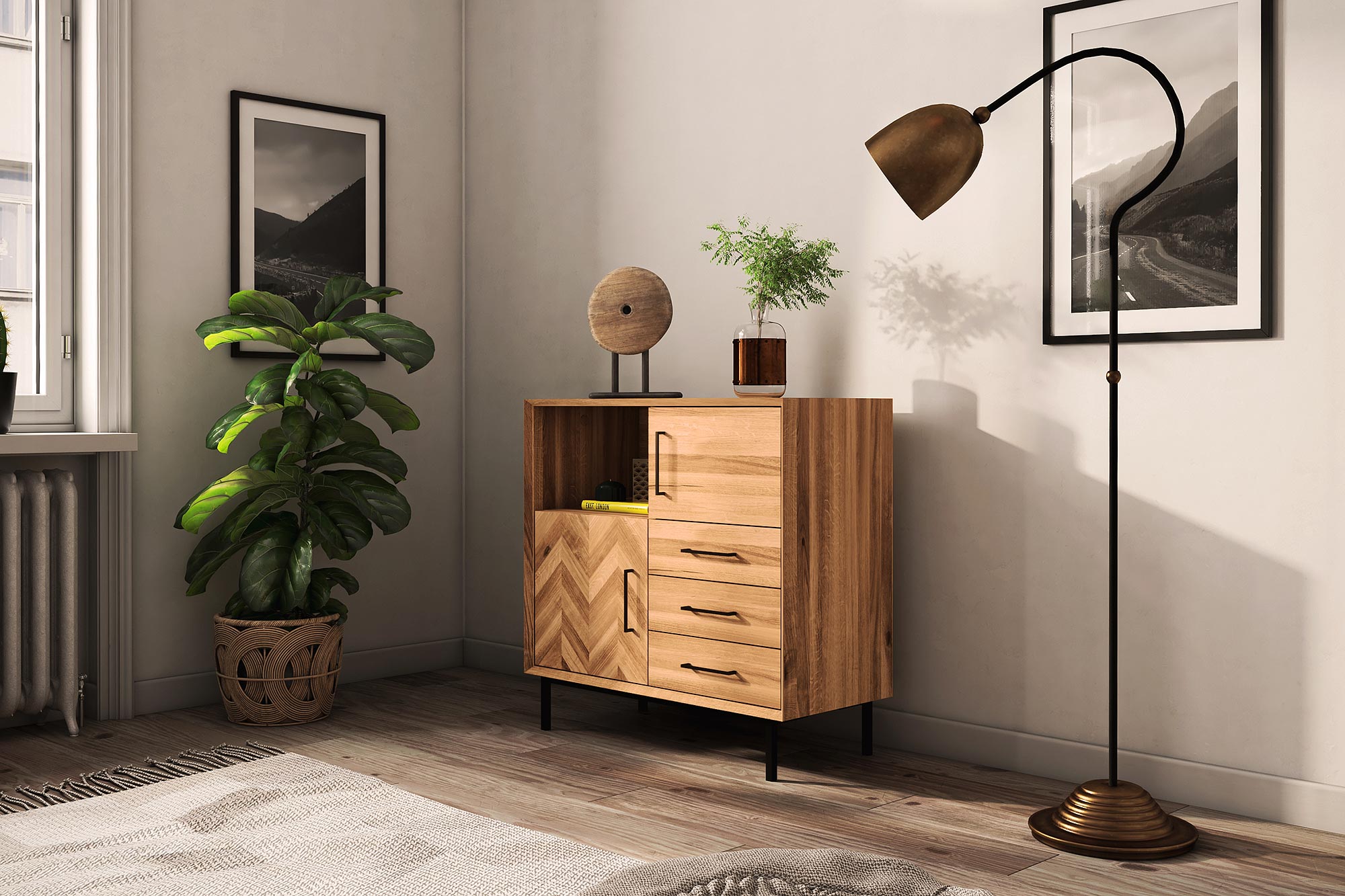Highbord - Kommode 2 Türen & 3 Schubladen & Freifach / Abies 2746. Die Möbelserie Abies verkörpert ein wenig den schlichten Look der 60er Jahre. VINTAGELOOK mit Handwerkskunst neu in Szene gesetzt! Diese Kommoden haben eine schöne Höhe von 95cm, etwas höher als herkömmliche Kommoden aber nicht so hoch wie ein Halbschrank. Durch diese Zwischengröße passen "SIE" in viele Wohnbereiche, ob im modernem Loft oder im Einfamilienhaus immer ein absoluter EYECATCHER! In dieser Modellserie finden Sie 4 verschiedene Ausführungen mit den Grundmaßen; B- 97 cm x T- 45 cm x H- 95 cm. Schöne Propositionen mit wechseln Fronten. An 3 Highbords dieser Serie finden Sie das "Fischgrätenmuster" in den Türen wieder.