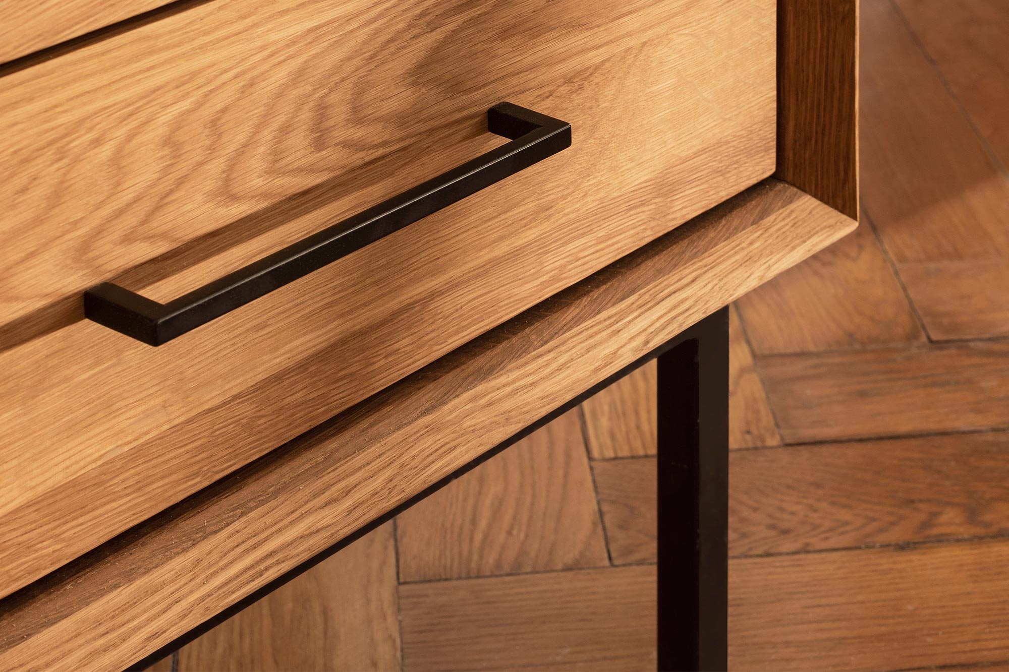 100% aus massivem Holz - durchgehende Lamellen , Lackierter Stahl Matt schwarz
