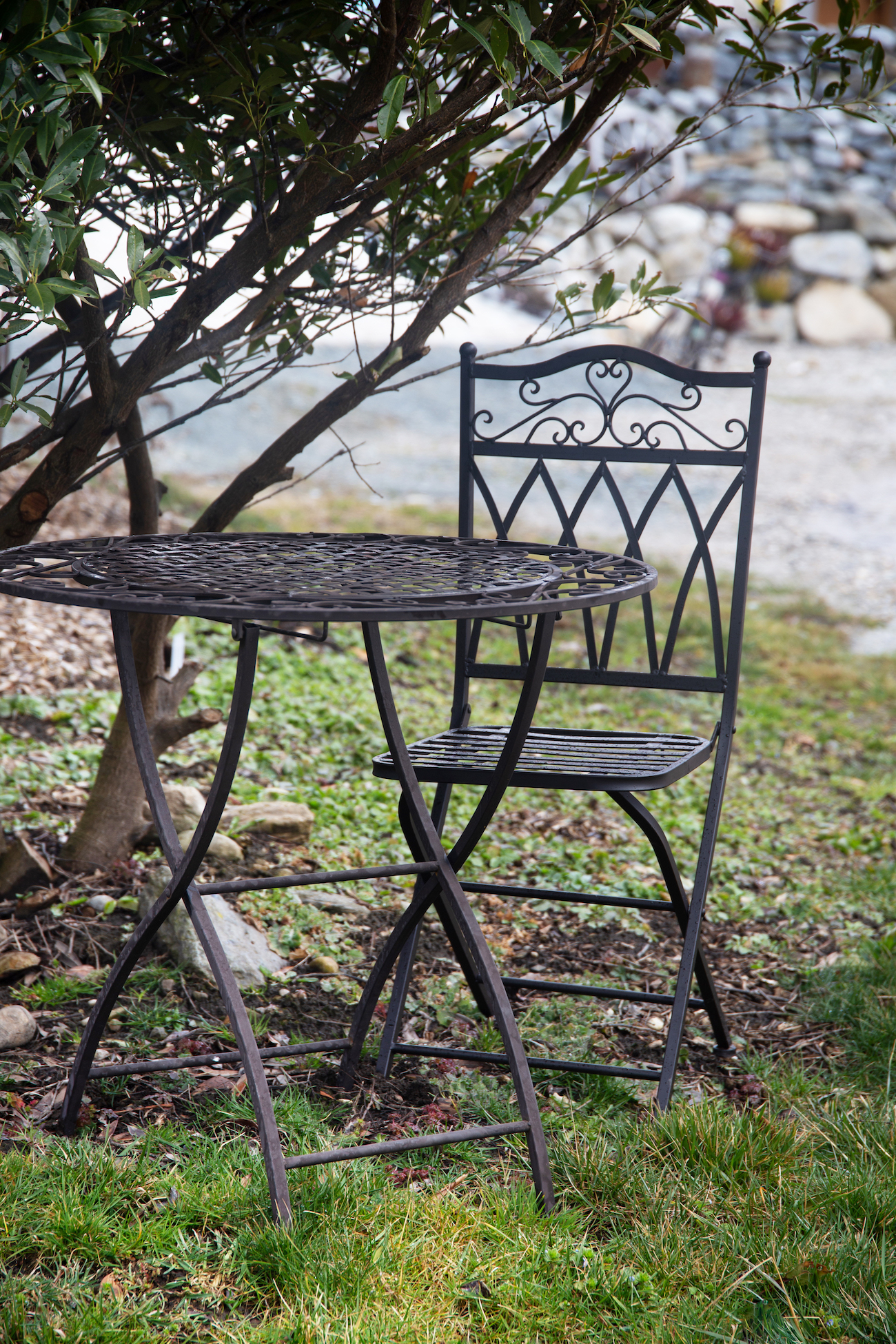 Produktinformationen "Klappbarer Gartenstuhl aus Metall – Dunkelbraun mit Zierornament"