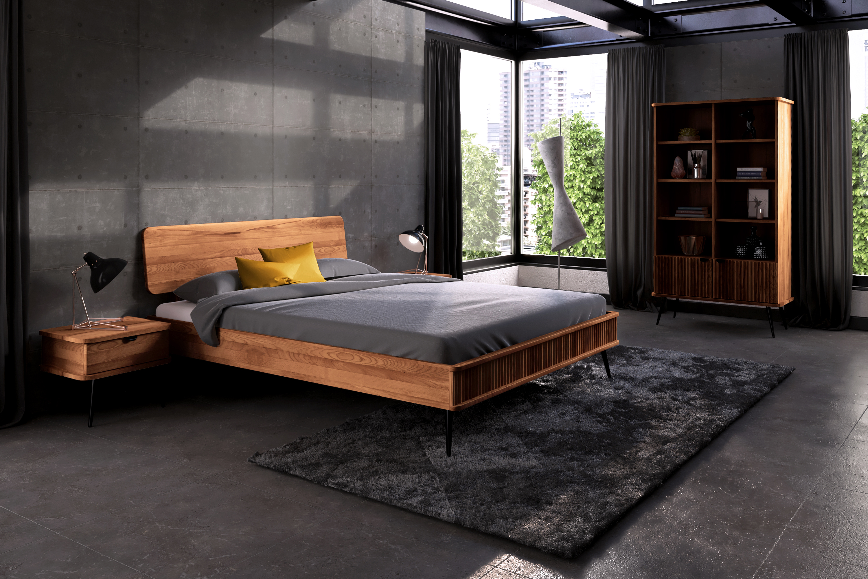 100% aus massivem Holz - durchgehende Lamellen , Lackierter Stahl Matt schwarz