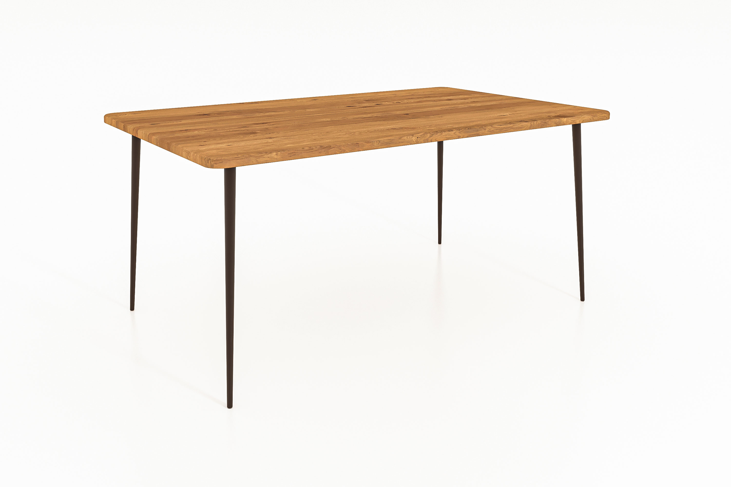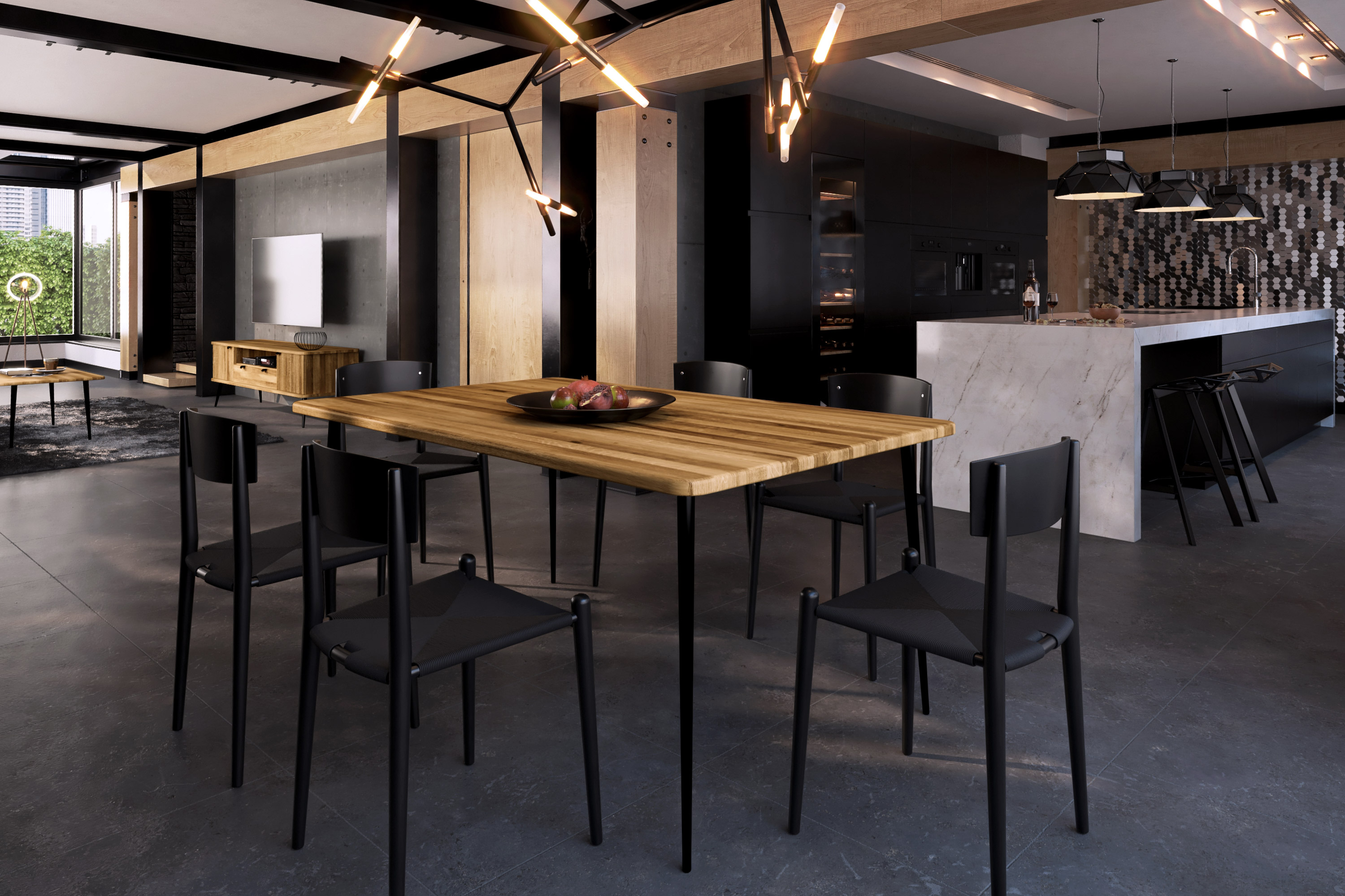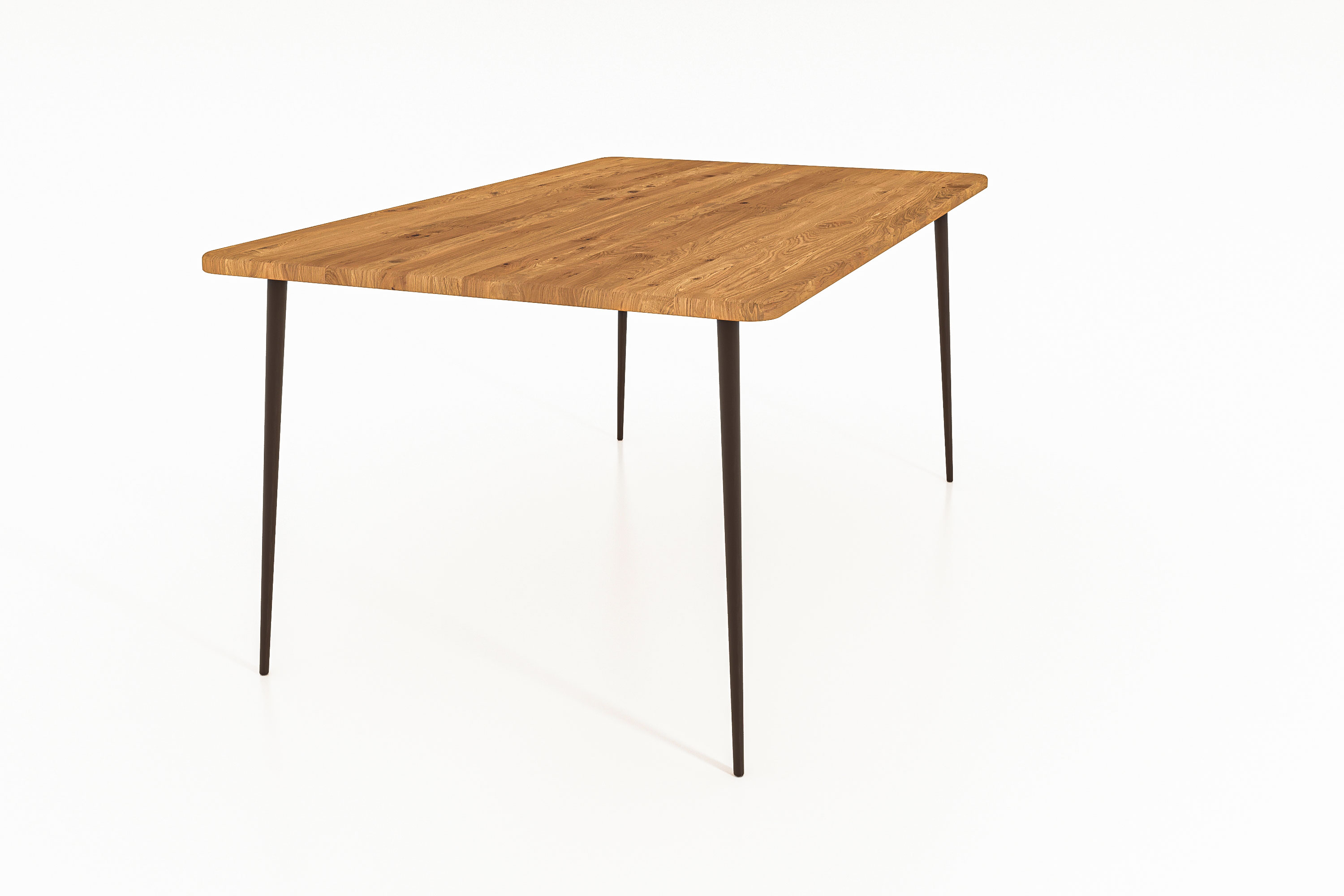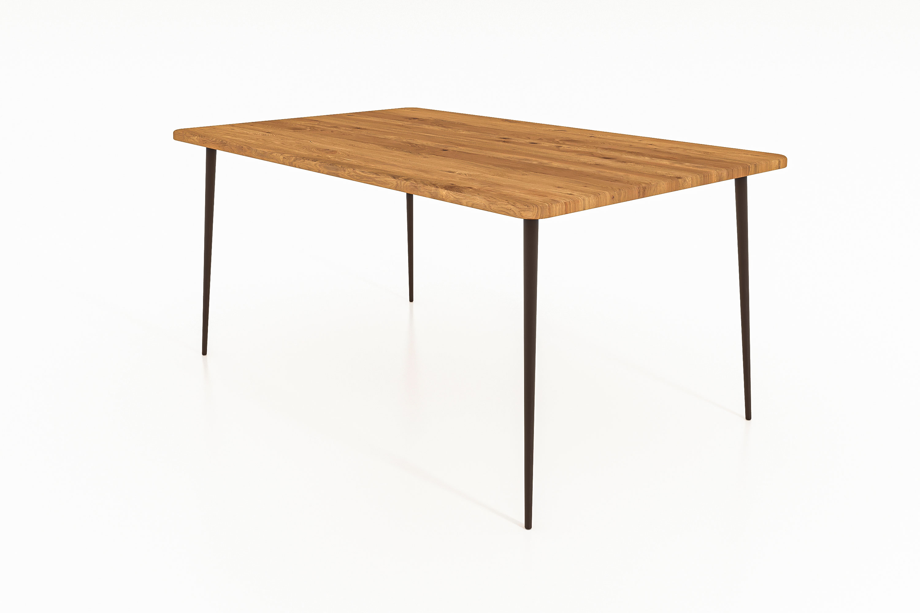 Esstisch, Küchentisch aber auch als Arbeitstisch geeignet. Die Tischplatte ist aus massiver Wildeiche gefertigt, sowie alle Produkte aus dieser Serie. Die Oberfläche sind mit Hartöl veredelt. Die Tischbeine sind aus lackiertem Stahl /schwarzmatt.