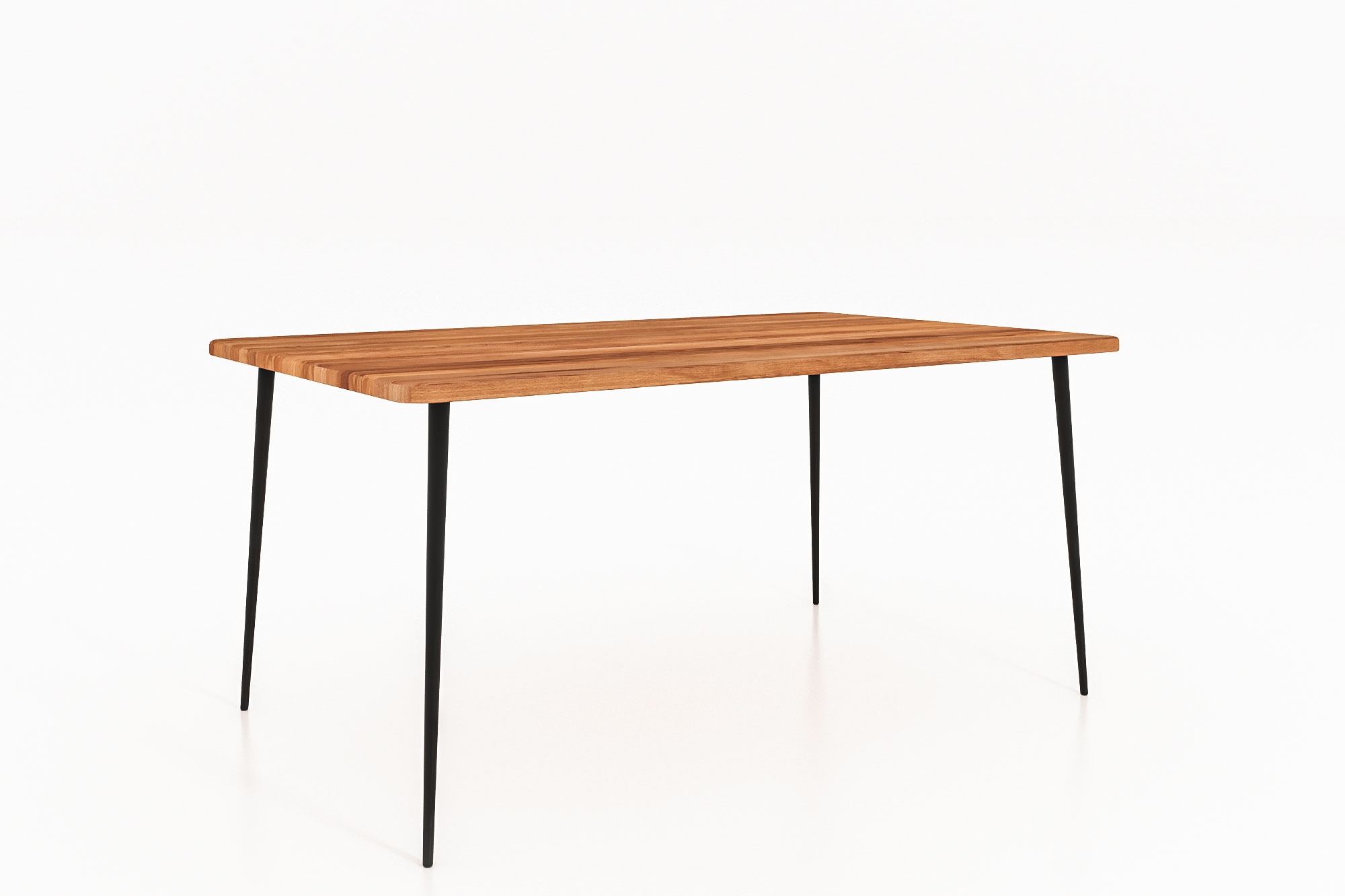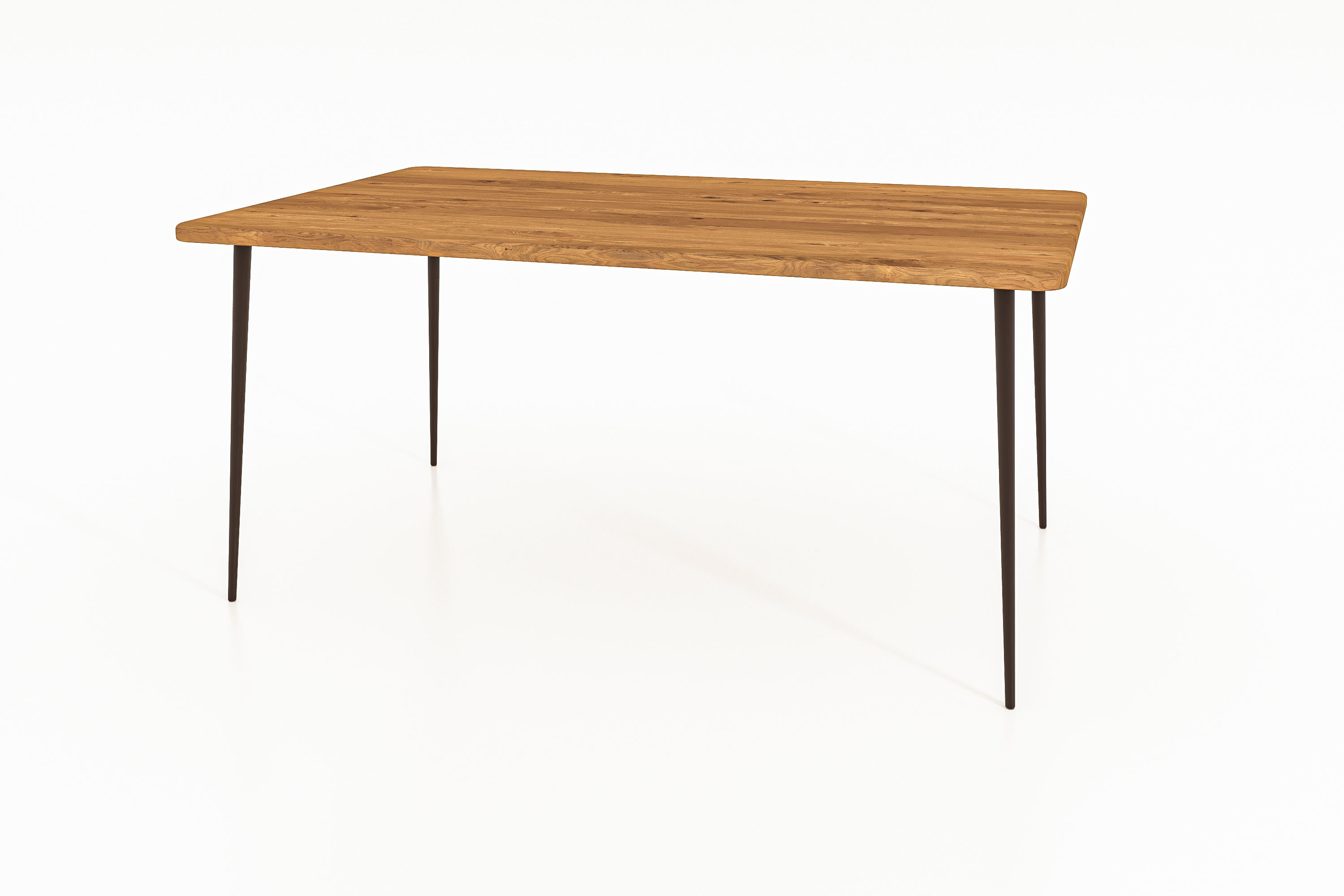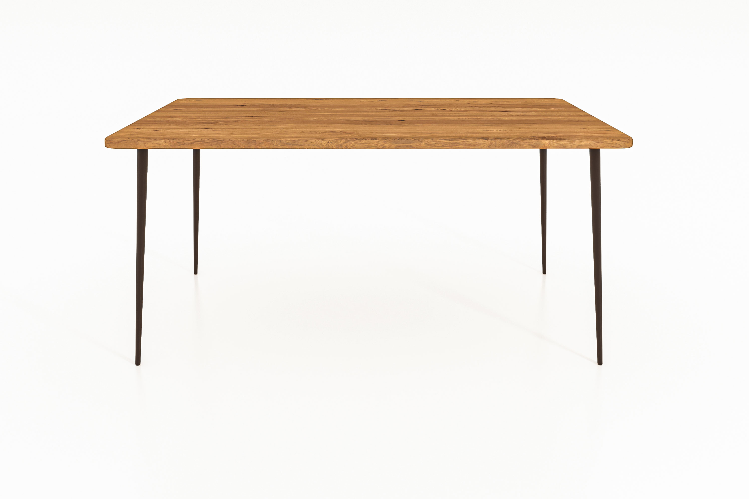 Esstisch, Küchentisch aber auch als Arbeitstisch geeignet. Die Tischplatte ist aus massiver Wildeiche gefertigt, sowie alle Produkte aus dieser Serie. Die Oberfläche sind mit Hartöl veredelt. Die Tischbeine sind aus lackiertem Stahl /schwarzmatt.