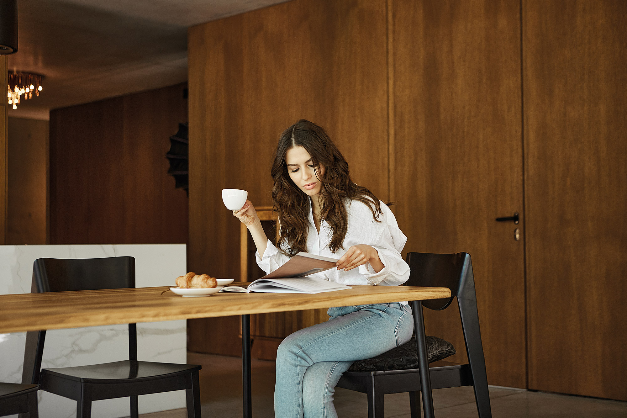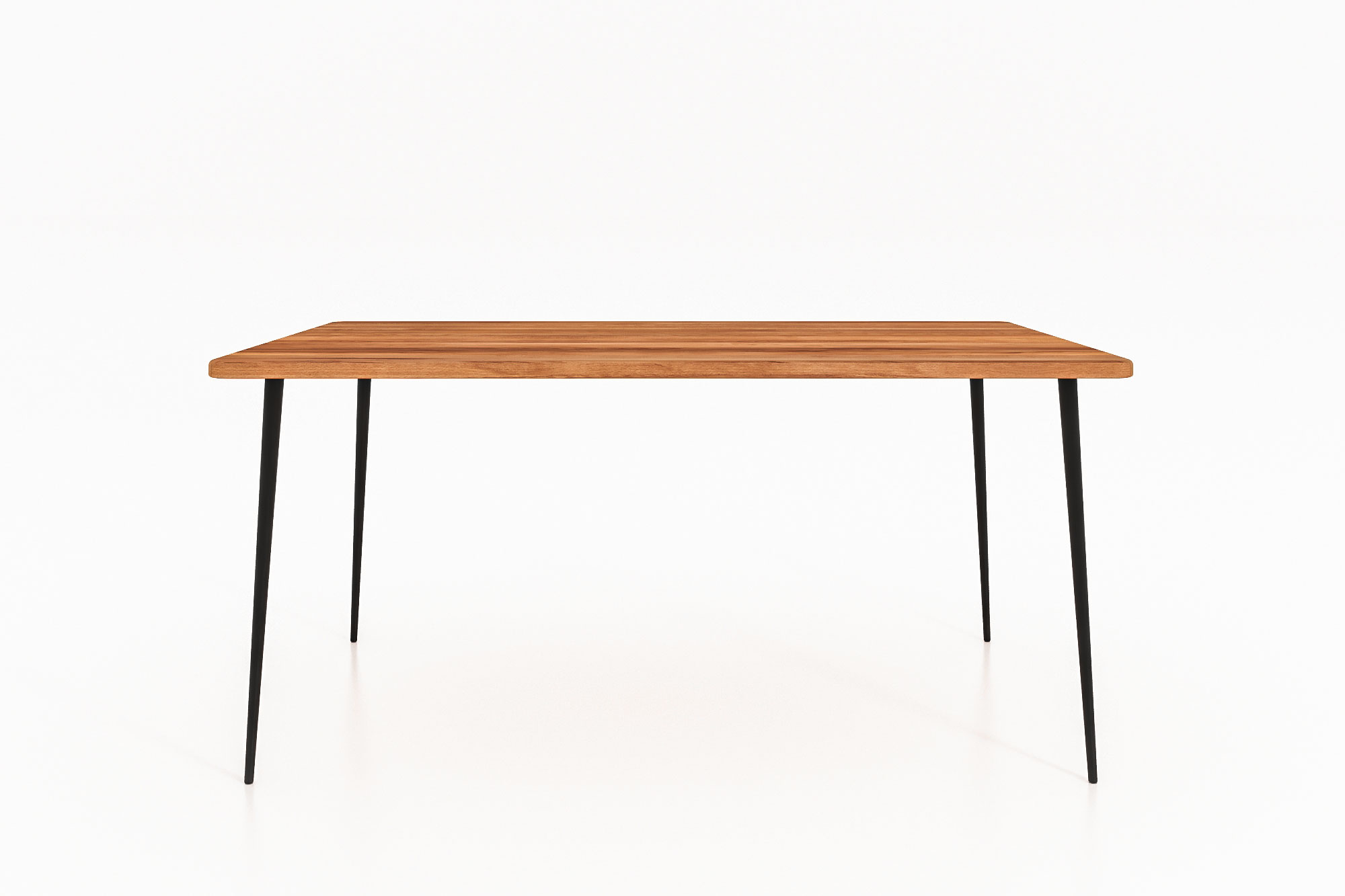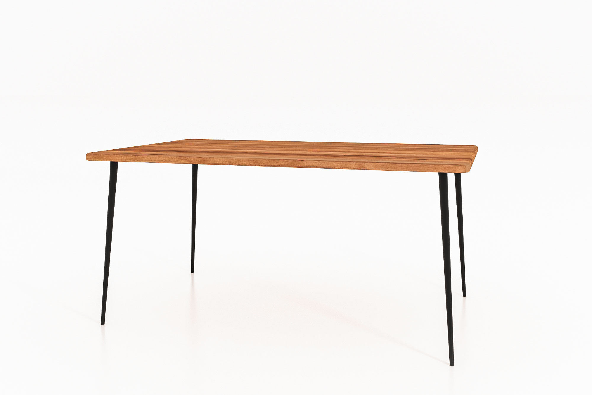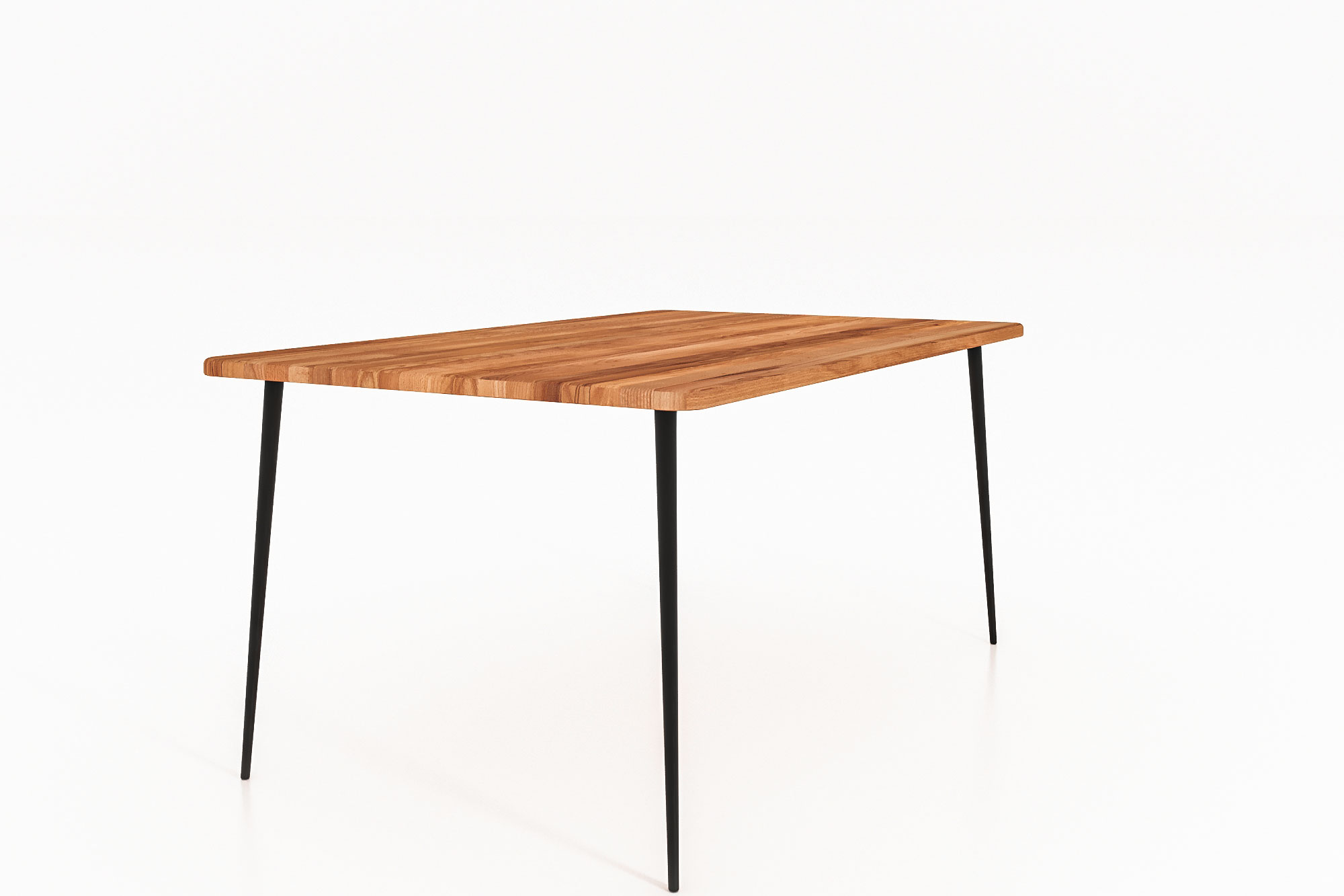 Esstisch, Küchentisch aber auch als Arbeitstisch geeignet. Die Tischplatte ist aus massiver Wildeiche gefertigt, sowie alle Produkte aus dieser Serie. Die Oberfläche sind mit Hartöl veredelt. Die Tischbeine sind aus lackiertem Stahl /schwarzmatt.