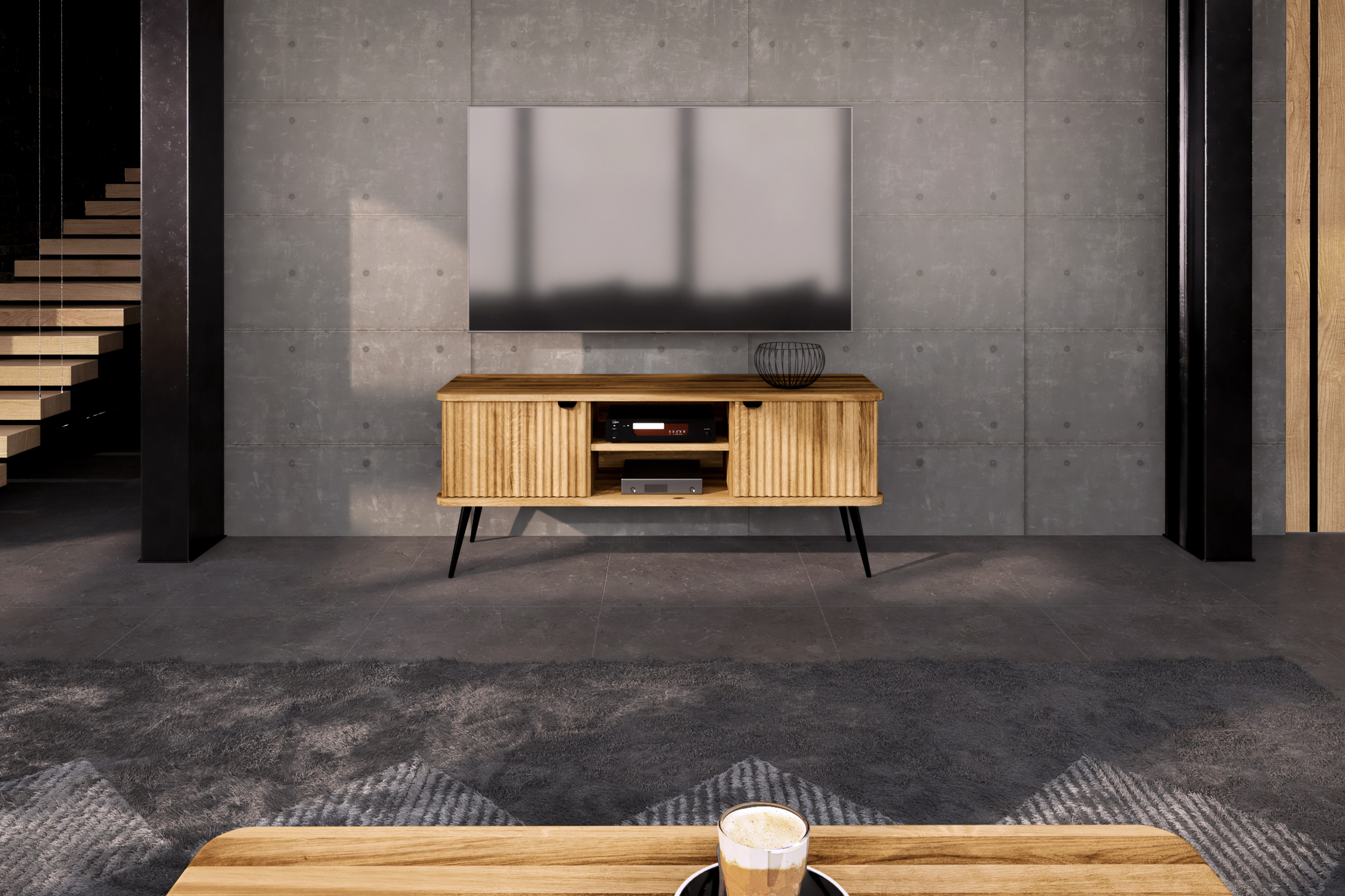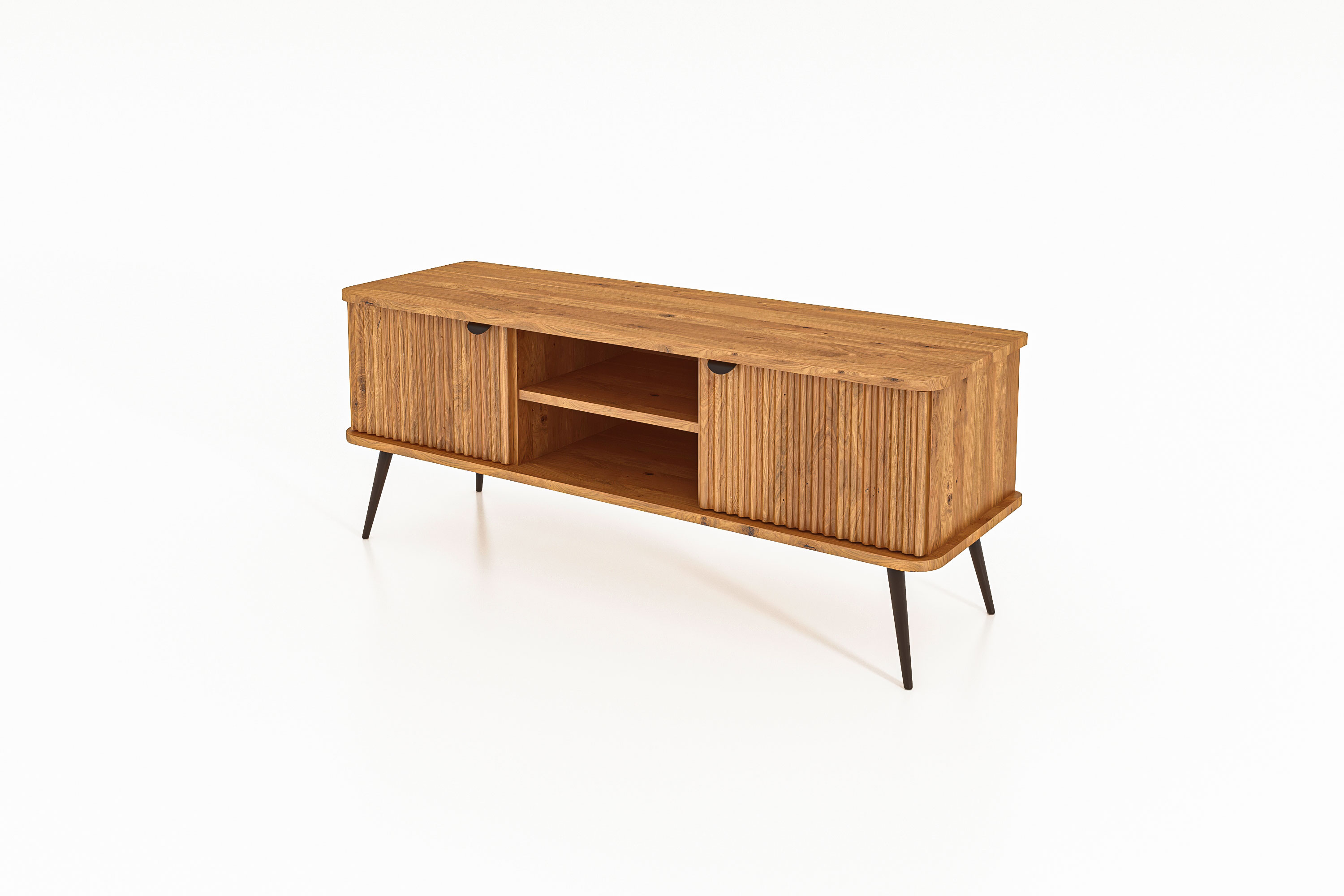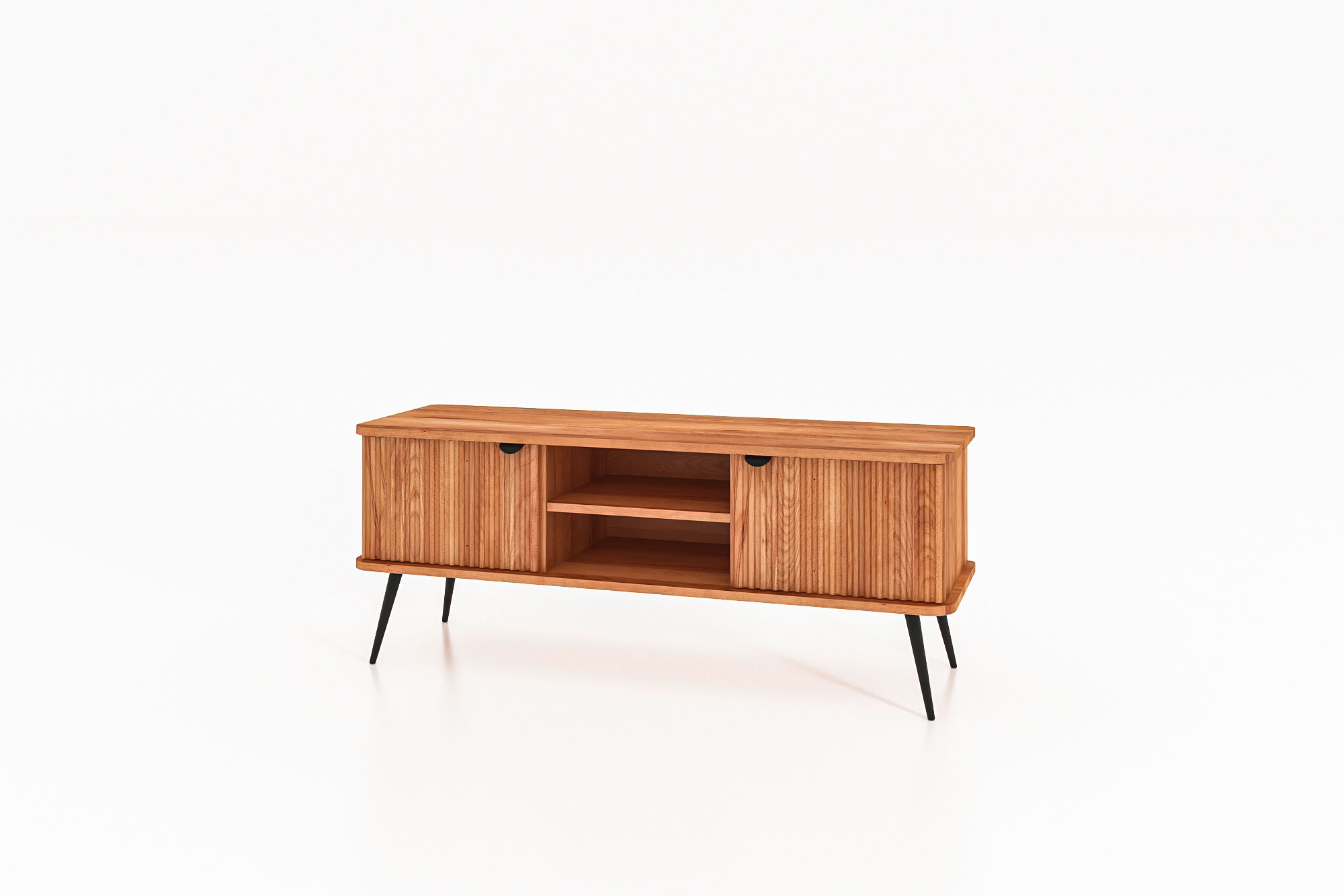 100% aus massivem Holz - durchgehende Lamellen , Lackierter Stahl Matt schwarz