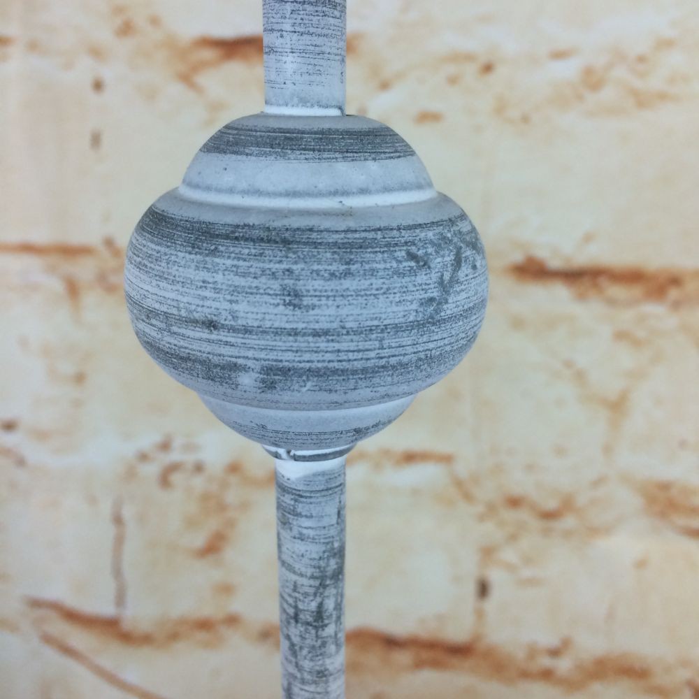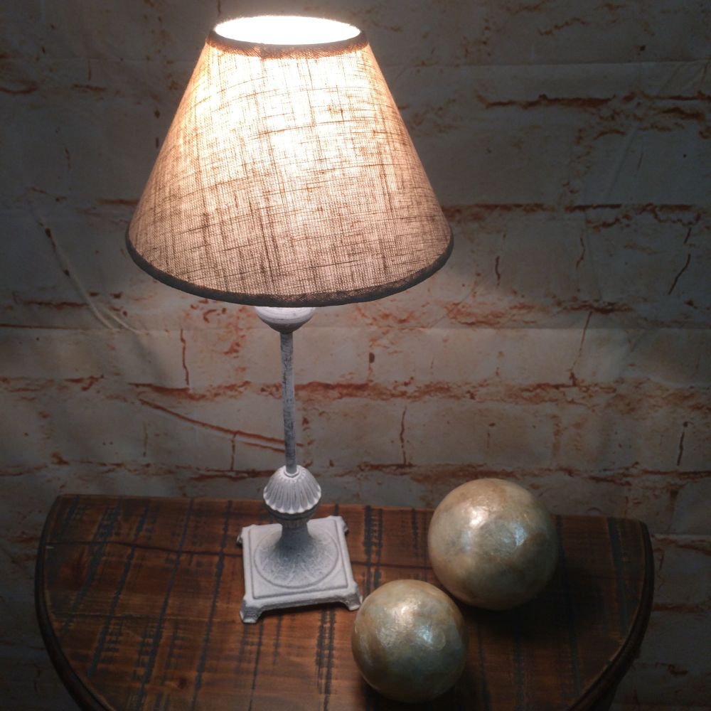 SHABBYLOOK! Tischleuchte mit Stoffschirm und einem Lampenfuss aus Metall. Der Lampenfuss ist antikweiß lackiert.