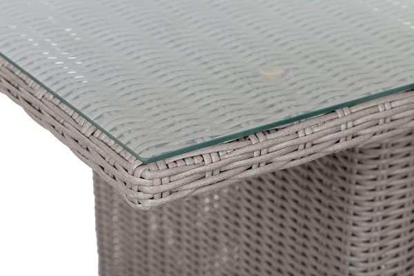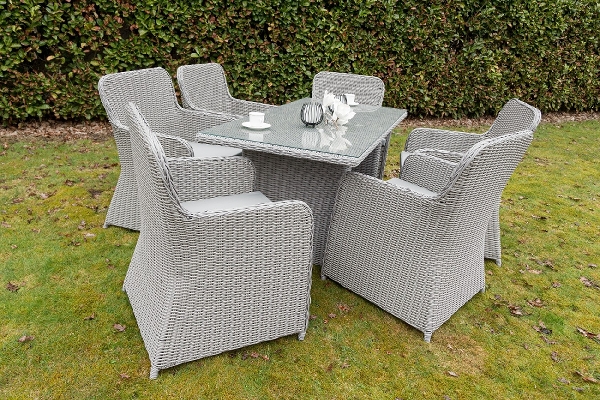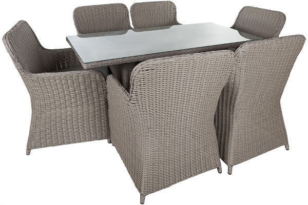 Dieses geflochtene Gartenmöbel Set besteht aus 6 Stühlen sowie einem rechteckigen Tisch mit einer Ablagefläche aus Glas.