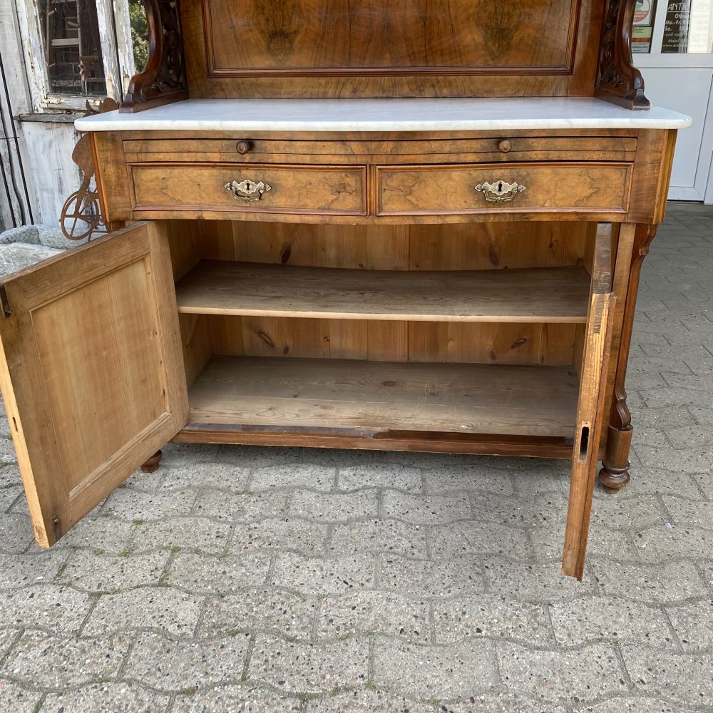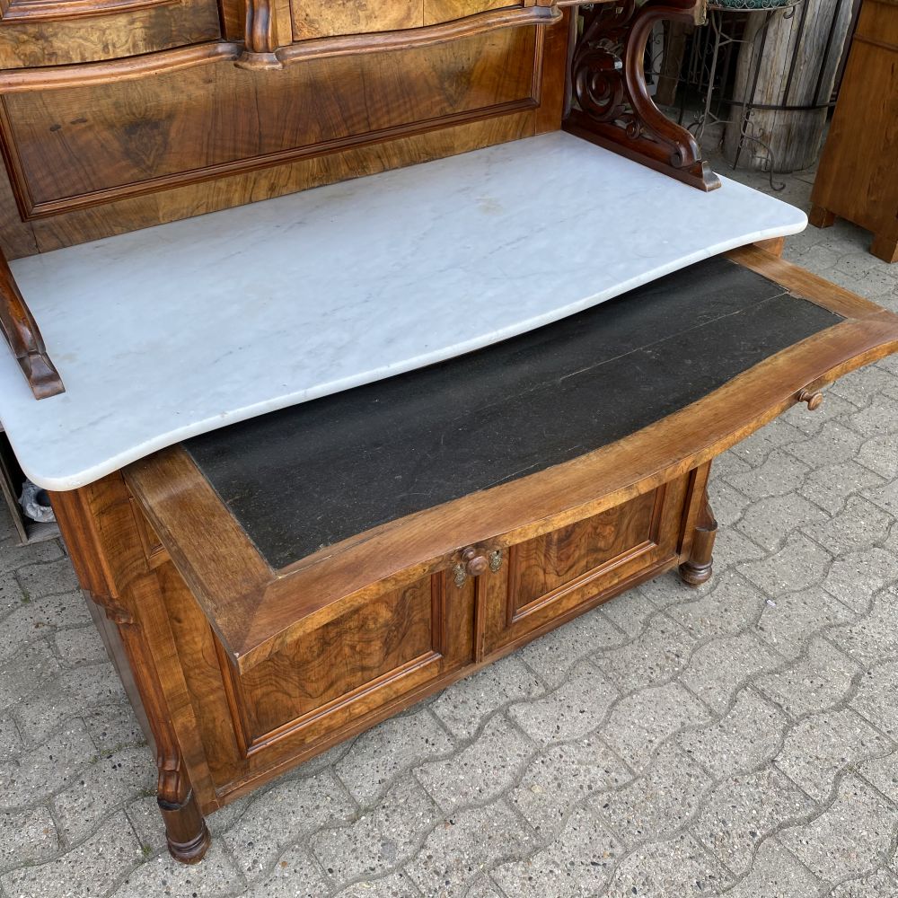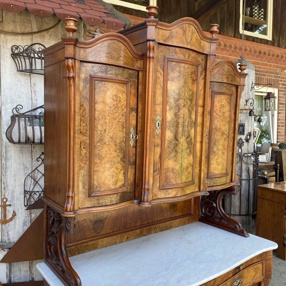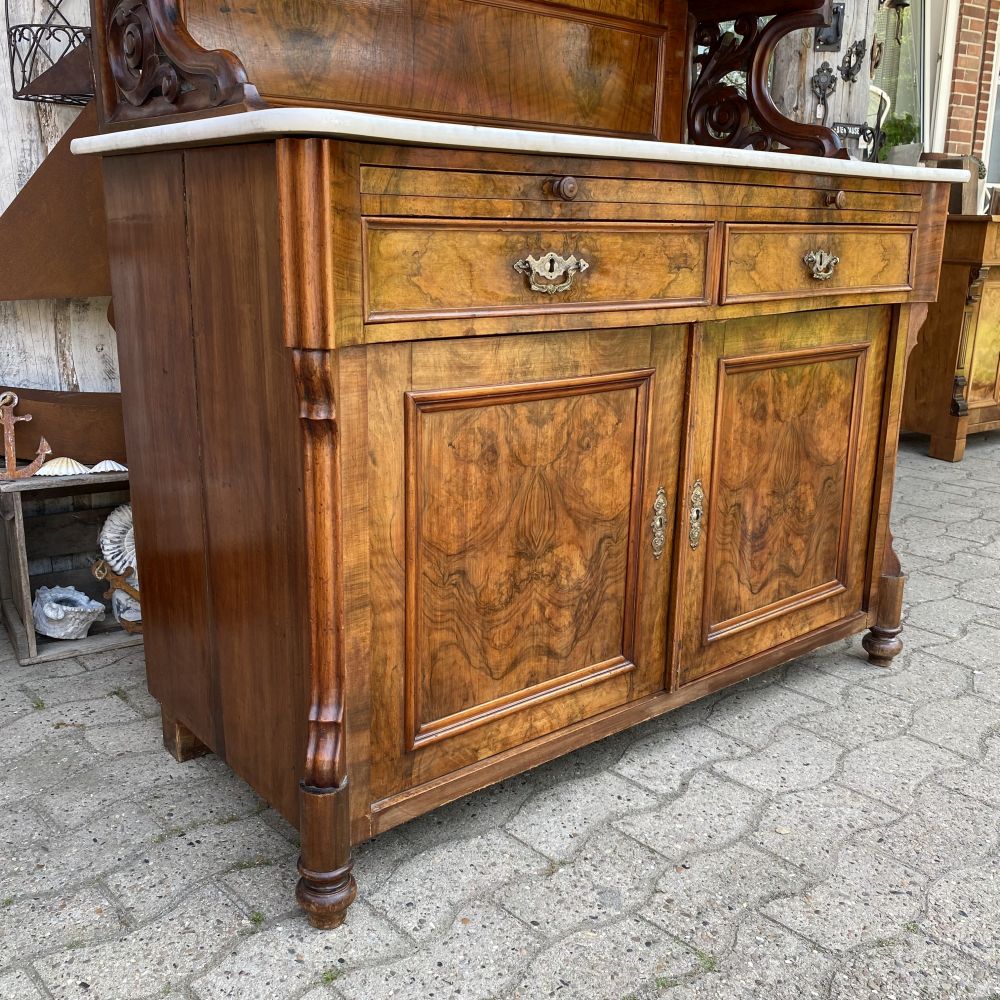 das ist ja ein tolles Möbelstück! Prunkvoller antiker Büffetschrank aus Nussbaumholz / um 1860. Wir bieten den Schrank unrestauriert an. Es fehlt ein Schloss und einige Schlüssel, An einer Seite am Unterteil hat der Schrank einen Spanungsriss. Der Schrank ist aber im großen und ganzen in einem gutem Zustand. Super schönes Furnierbild in den Füllungen die dazu noch geschwungen gearbeitet wurden. Die Möbelbeschläge stammen aus der Zeit und sind alle da. Die Wangen im Schrankmittelteil sind hübsch verziert und sind von Hand geschnitzt. Auch die Stirnbretter am Kopf des Schrankes sind geschwungen verabeitet. Im Oberteil befinden sich 3 Türen mit Einlegeböden dahinter, unter der Marmorplatte die man für Transporte abnehmen kann, befindet sich ein Tablettauszug. Im Unterteil zwei große Schubladen und ein großes Staufach. Falls es nicht Ihr eigenes "PROJEKT" zum aufarbeiten, überstreichen oder umgestalten werden sollte, wir bieten das schöne Stück erst einmal unrestauriert an. Auf Anfrage erstellen wir gern ein Angebot zu einer Restauration. Gebrauchsspuren, kleine Macken, Kratzer und Abplatzer sind alters bedingt vorhanden ( siehe Fotos). Vielleicht ist das auch mal ein tolles Geschenk für Ihre Liebsten!? Stöbern Sie noch ein wenig weiter hier bei uns auf WUNDERBAAReS.de... es gibt viel zu entdecken! Achtung! Falls Sie mehrere Artikel in Ihren Warenkorb gelegt haben und Ihnen die Versandkosten zu hoch erscheinen, melden Sie sich Bitte bei uns. Unserer Programm kann in einigen Fällen Artikel nicht zusammen fassen und berechnet dann zu hohe Versandkosten. Wir bitten um Ihr Verständnis.