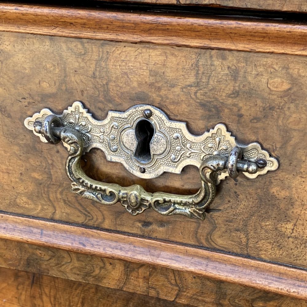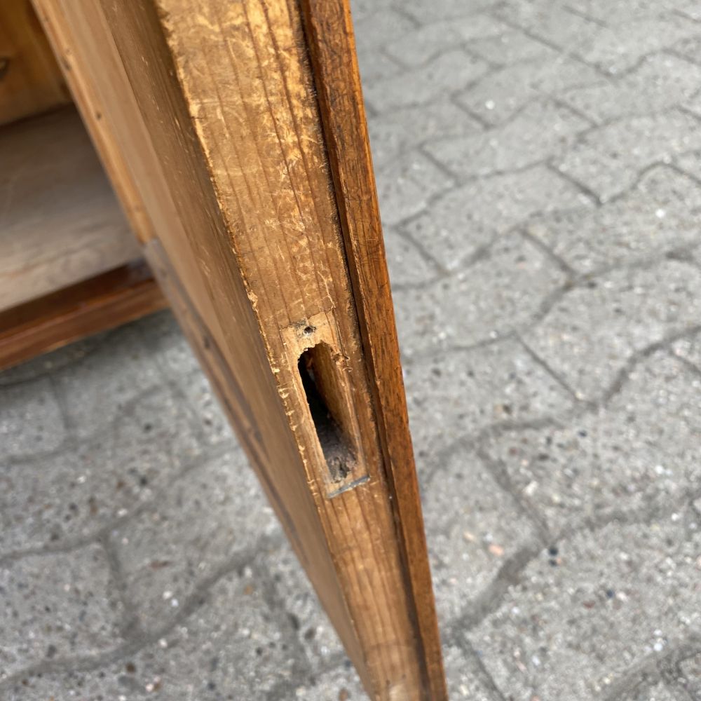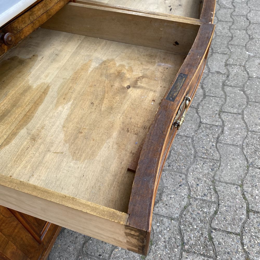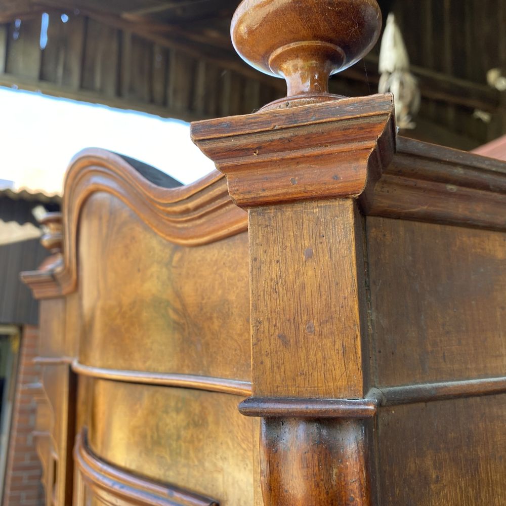 das ist ja ein tolles Möbelstück! Prunkvoller antiker Büffetschrank aus Nussbaumholz / um 1860. Wir bieten den Schrank unrestauriert an. Es fehlt ein Schloss und einige Schlüssel, An einer Seite am Unterteil hat der Schrank einen Spanungsriss. Der Schrank ist aber im großen und ganzen in einem gutem Zustand. Super schönes Furnierbild in den Füllungen die dazu noch geschwungen gearbeitet wurden. Die Möbelbeschläge stammen aus der Zeit und sind alle da. Die Wangen im Schrankmittelteil sind hübsch verziert und sind von Hand geschnitzt. Auch die Stirnbretter am Kopf des Schrankes sind geschwungen verabeitet. Im Oberteil befinden sich 3 Türen mit Einlegeböden dahinter, unter der Marmorplatte die man für Transporte abnehmen kann, befindet sich ein Tablettauszug. Im Unterteil zwei große Schubladen und ein großes Staufach. Falls es nicht Ihr eigenes "PROJEKT" zum aufarbeiten, überstreichen oder umgestalten werden sollte, wir bieten das schöne Stück erst einmal unrestauriert an. Auf Anfrage erstellen wir gern ein Angebot zu einer Restauration. Gebrauchsspuren, kleine Macken, Kratzer und Abplatzer sind alters bedingt vorhanden ( siehe Fotos). Vielleicht ist das auch mal ein tolles Geschenk für Ihre Liebsten!? Stöbern Sie noch ein wenig weiter hier bei uns auf WUNDERBAAReS.de... es gibt viel zu entdecken! Achtung! Falls Sie mehrere Artikel in Ihren Warenkorb gelegt haben und Ihnen die Versandkosten zu hoch erscheinen, melden Sie sich Bitte bei uns. Unserer Programm kann in einigen Fällen Artikel nicht zusammen fassen und berechnet dann zu hohe Versandkosten. Wir bitten um Ihr Verständnis.