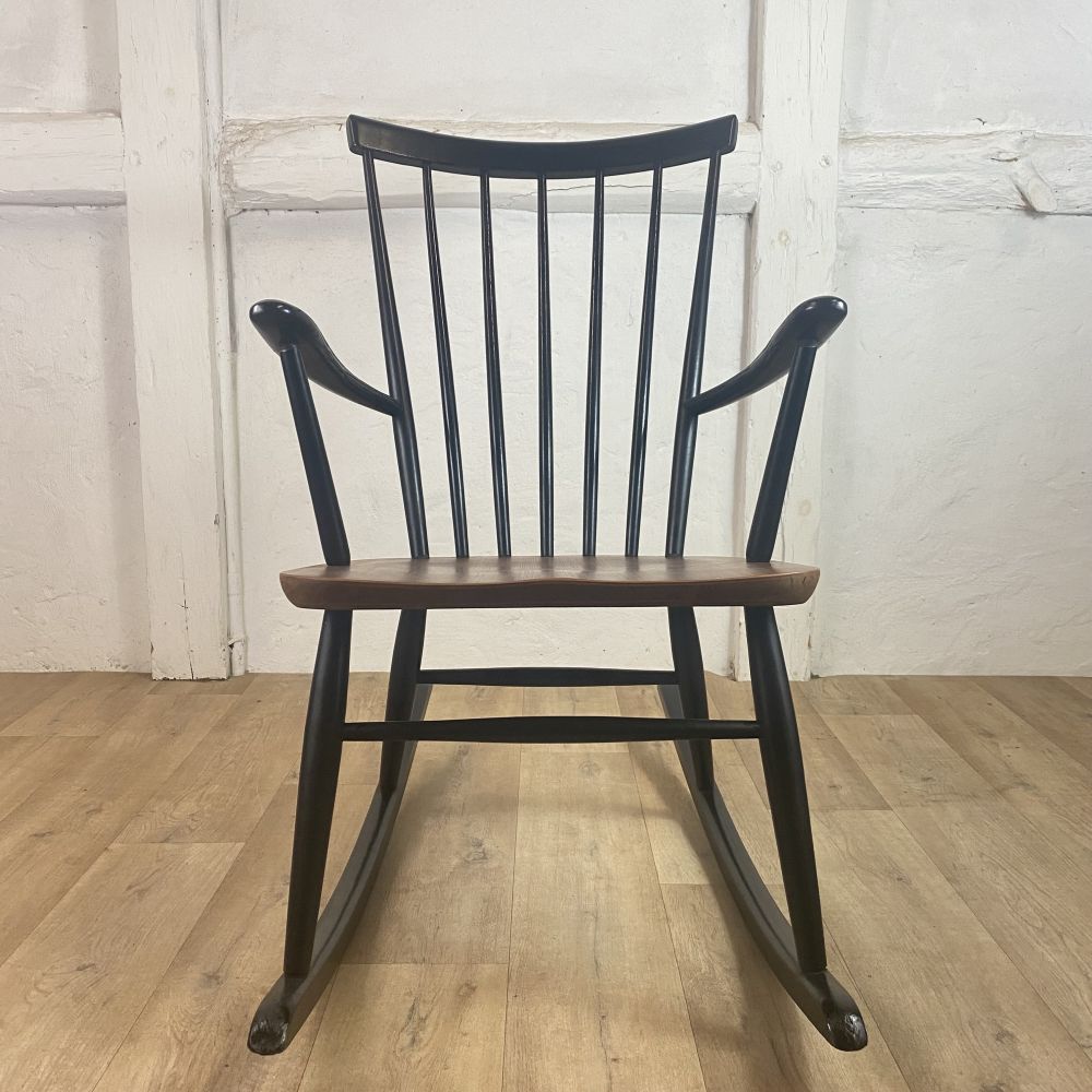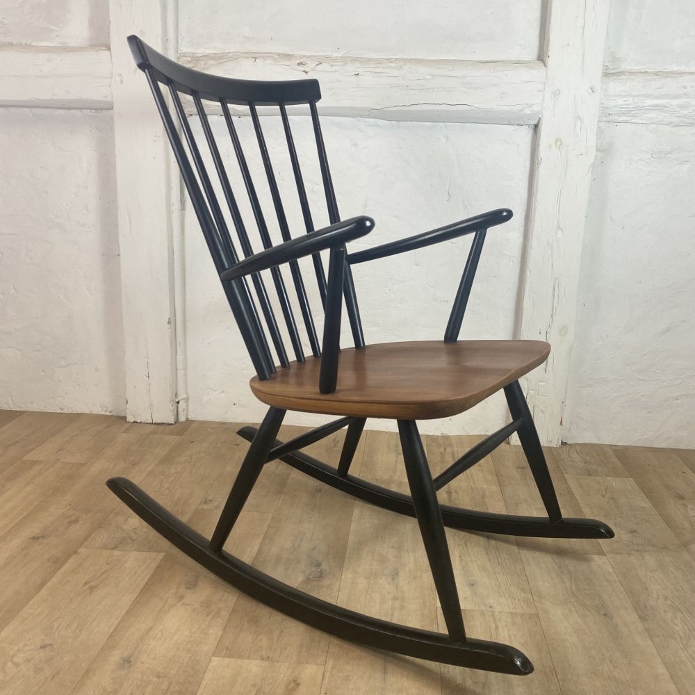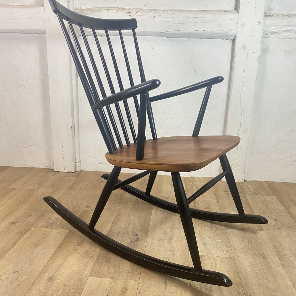 Schaukelstuhl - Klassiker / Mid Century , Design aus den 60er Jahren. Der Stuhl wurde aus Teakholz und Buchenholz gefertigt. Unter der Sitzfläche befinden sich noch alte Stempel, leider sind diese nicht mehr lesbar. Der Stuhl befindet sich in einem sehr guten Zusand. Wir bieten den Stuhl aber dennoch als unrestauriert an. Falls es nicht Ihr eigenes "PROJEKT" zum aufarbeiten, überstreichen oder umgestalten werden sollte, wir bieten das schöne Stück erst einmal unrestauriert an. Auf Anfrage erstellen wir gern ein Angebot zu einer Restauration. Gebrauchsspuren, kleine Macken, Kratzer und Abplatzer sind alters bedingt vorhanden ( siehe Fotos).