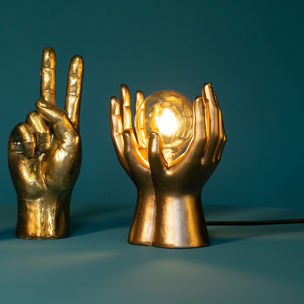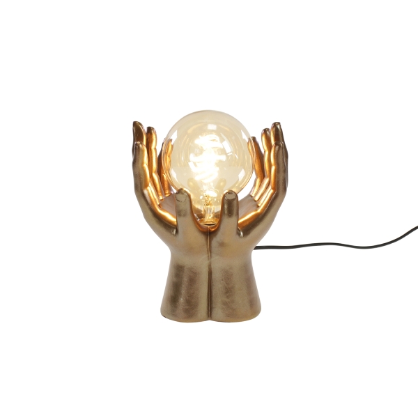 Produktinformationen "Tischleuchte Golden Touch, gold , Hände halten das Leuchtmittel Werner Voss"