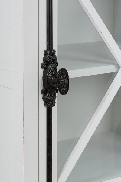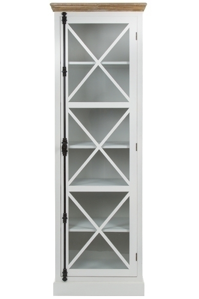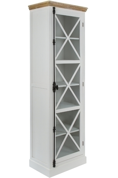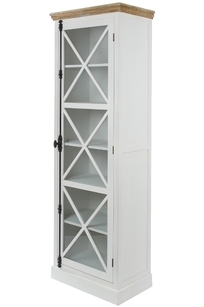 Die weiß gewischten Oberflächen und die hübsche Glastür mit charakteristischen X Sprossen mit abgesetzten Holzelementen sorgen dafür, dass diese Vitrine ein Highlight in Ihrem Zuhause sein wird.