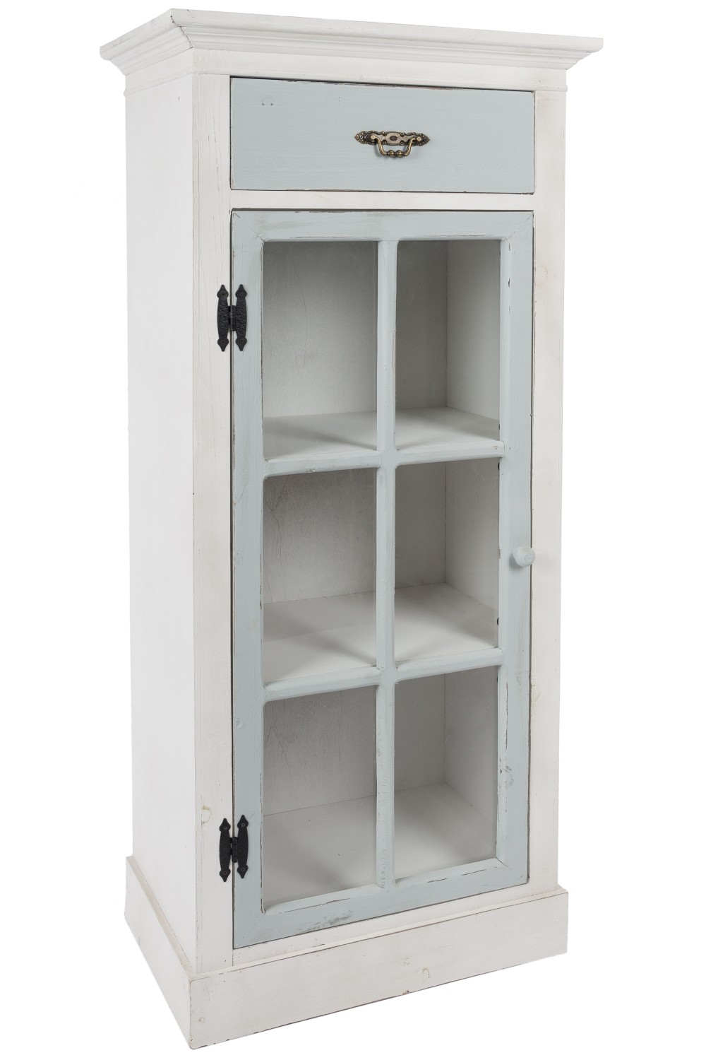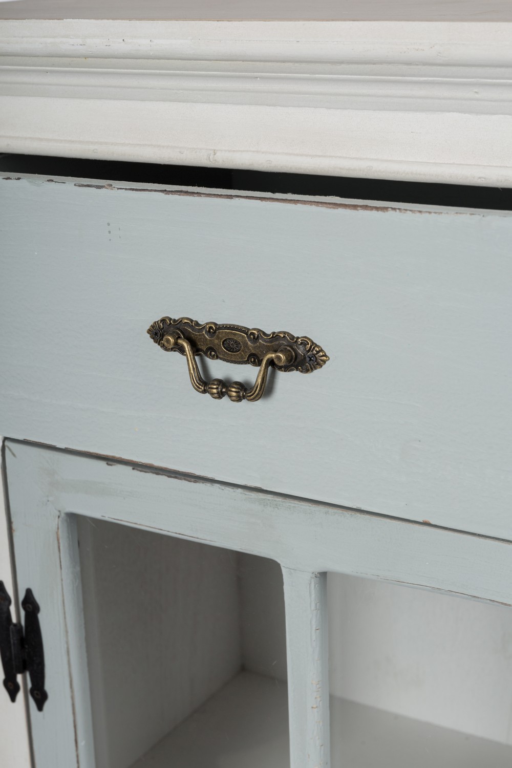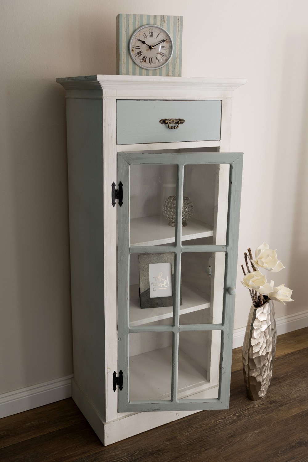 Der Korpus ist im beliebten Antikweiß mit einer grauen Vitrinentür und einer grauen Schublade gefertigt.