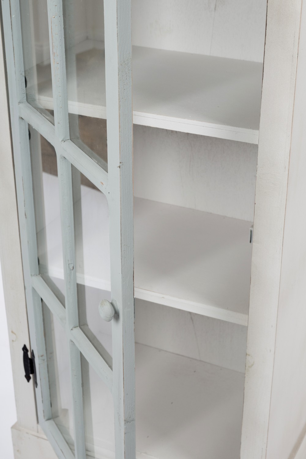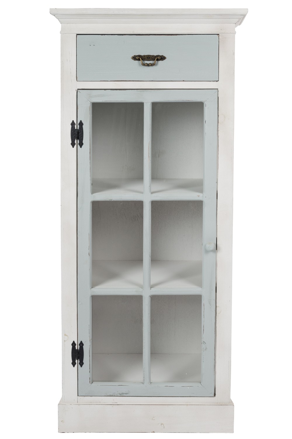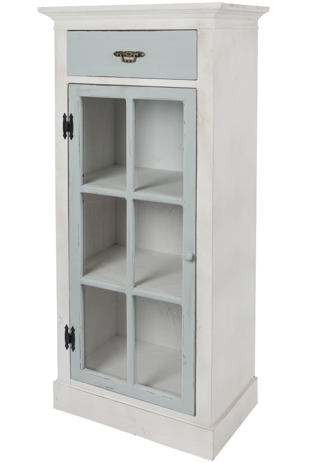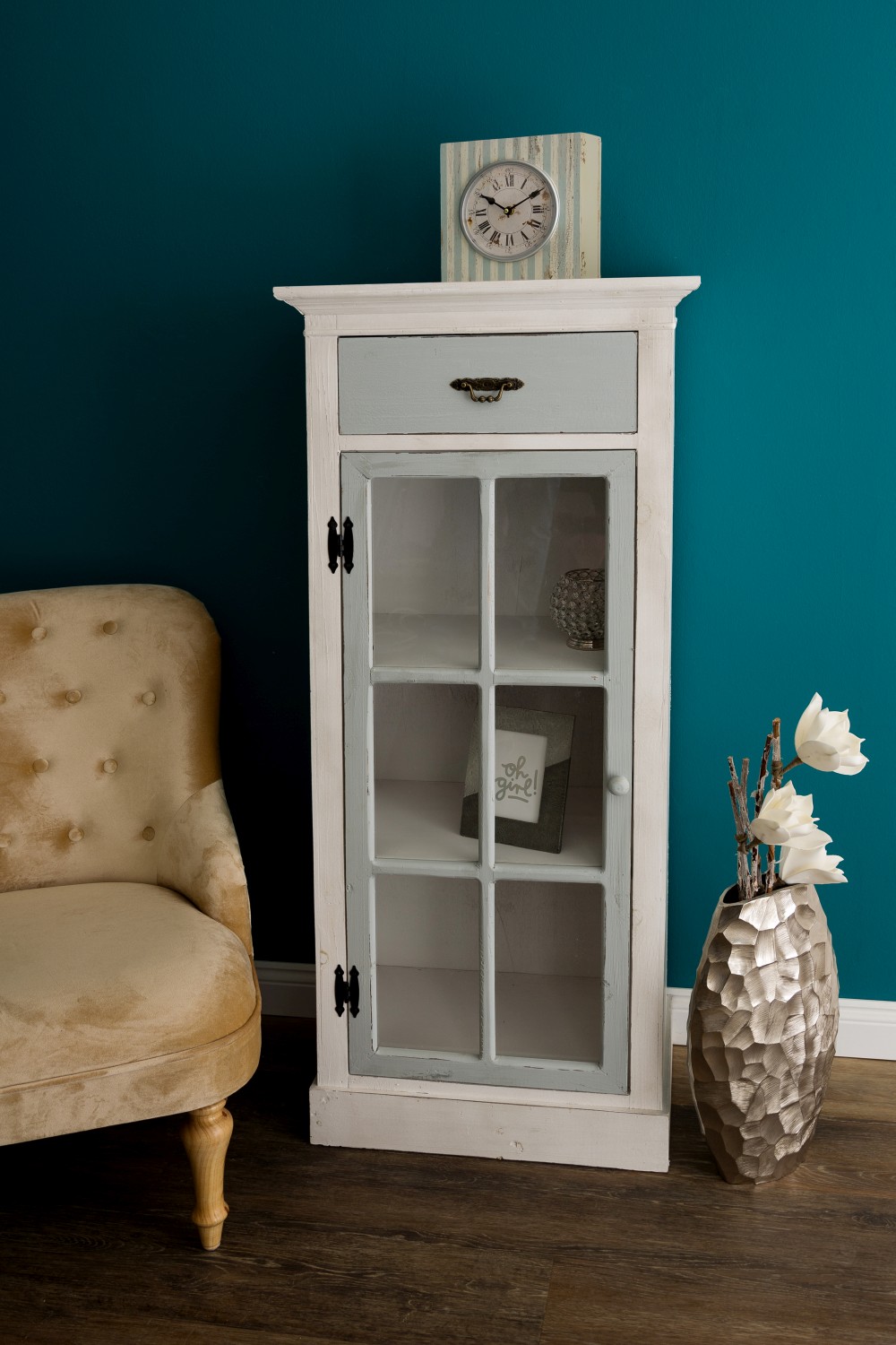 Der Korpus ist im beliebten Antikweiß mit einer grauen Vitrinentür und einer grauen Schublade gefertigt.