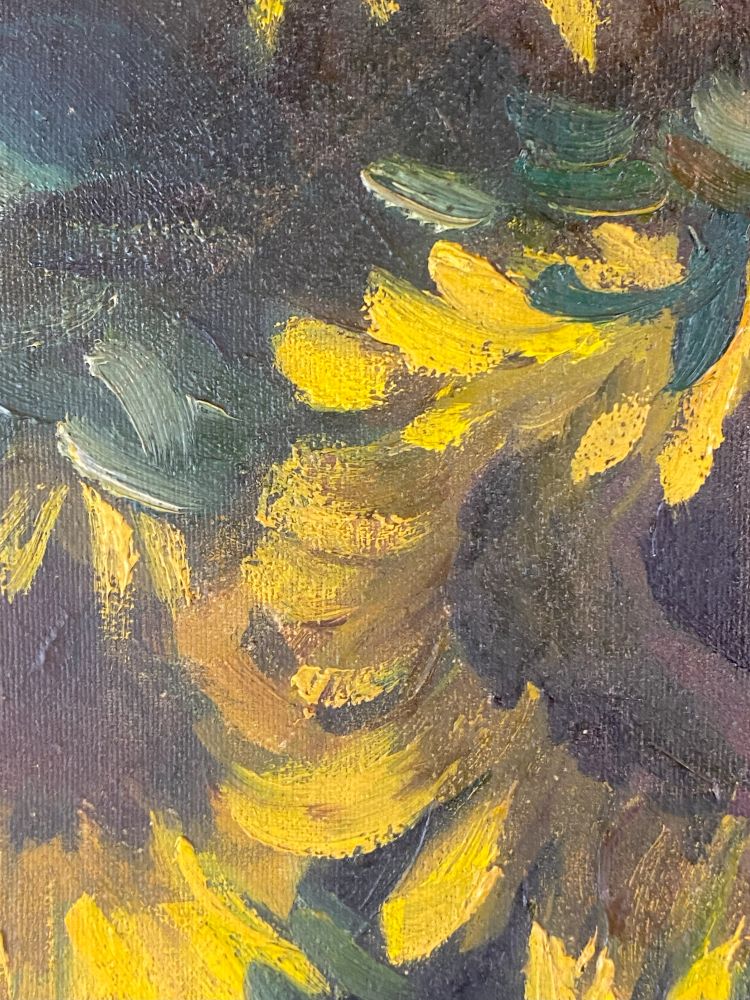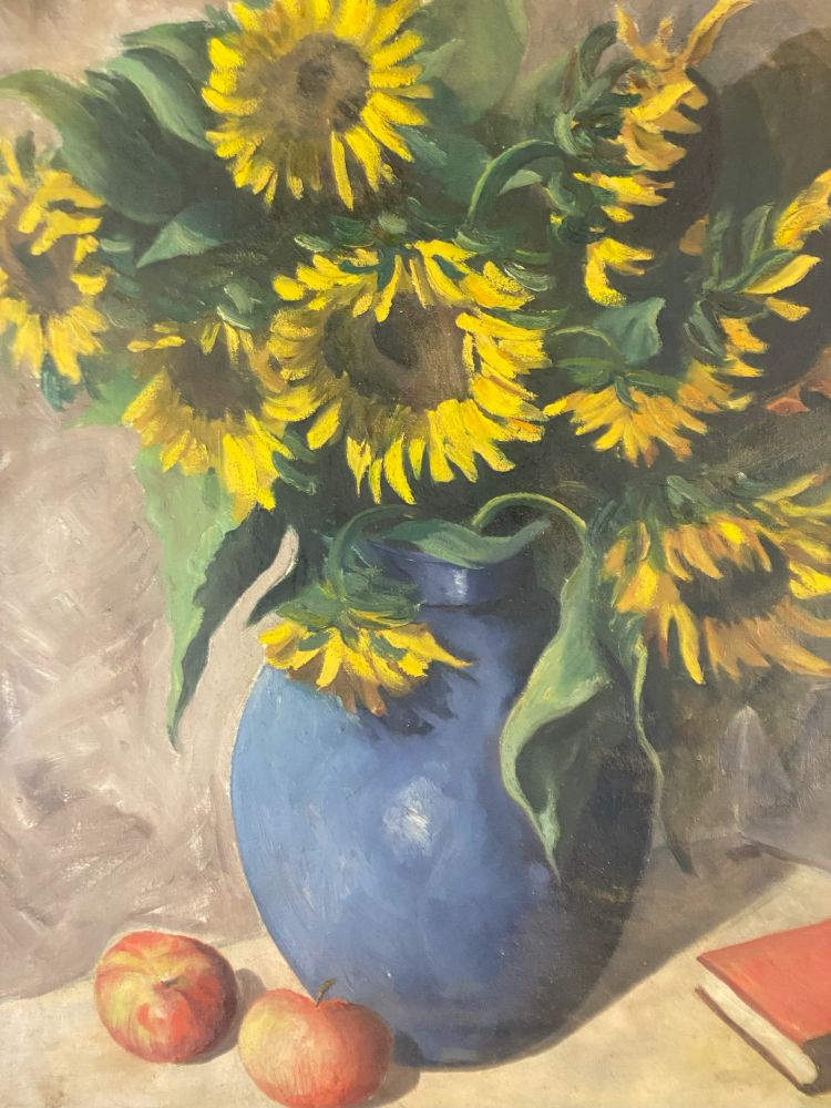 Öl-Gemälde Sonnenblumen in blauer Vase. Der Maler hat das Gemälde unten rechts signiert mit; F. 47.