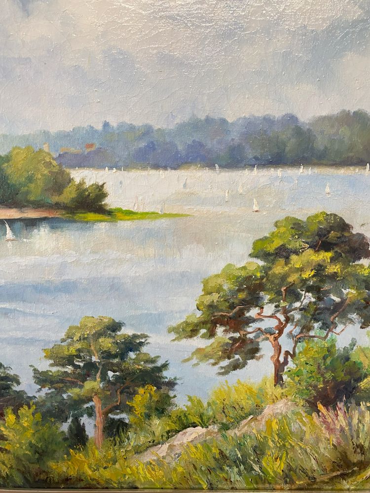 Öl-Gemälde "an der Havel" / von Siegfried Rochel (1904-1985)deutscher Landschaftsmaler. Das Gemälde wurde auf Leinwand gemalt. Der Künstler hat das Bild auf der Rückseite beschriftet und vorne links signiert. Der Rahmen wird mitgeliefert. Maße mit Rahmen 70 x91 cm / ohne Rahmen 55 x 75 cm.
