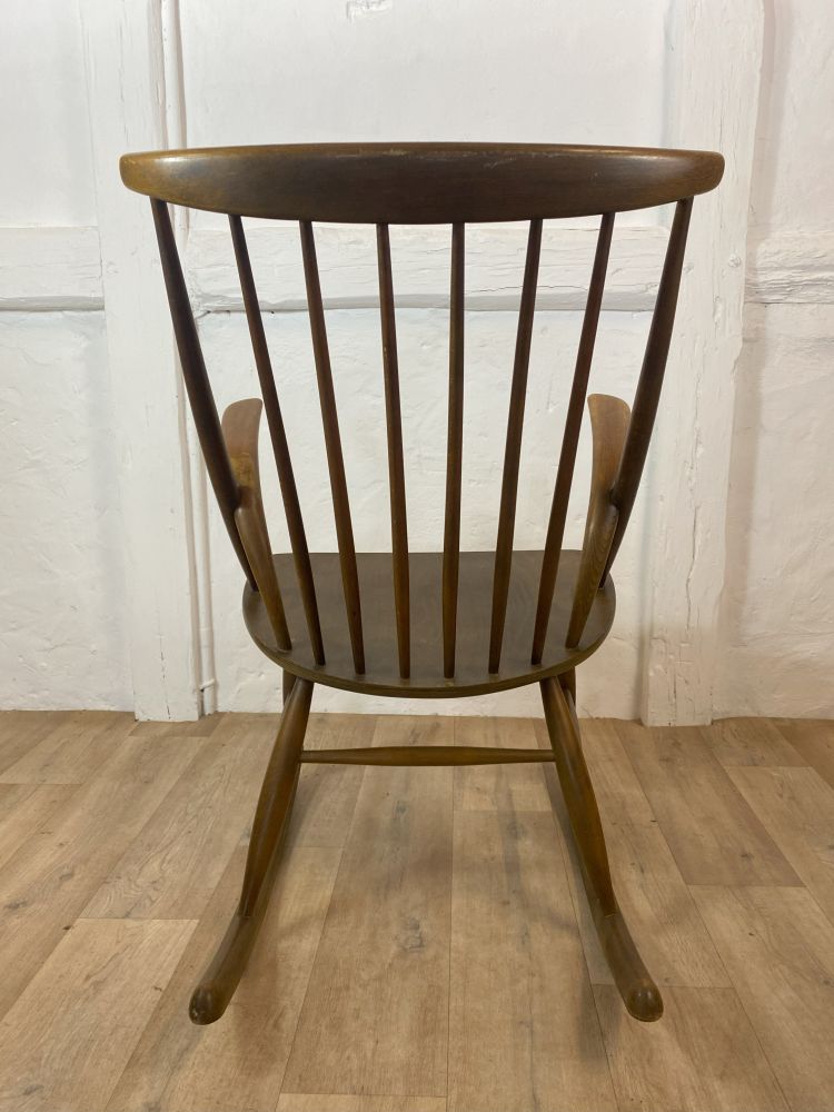 Schaukelstuhl Danish - Design 60er Jahre. Ein noch unberührter Möbelklassiker zum Aufarbeiten, überstreichen, oder einfach so lassen. Gefertigt wurde dieser formschöne Schaukelstuhl aus Buchenholz, dass dann im Anschluss nussbaumfarbend eingefärbt wurde.